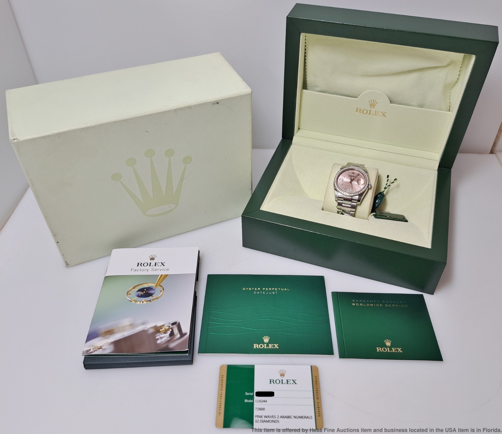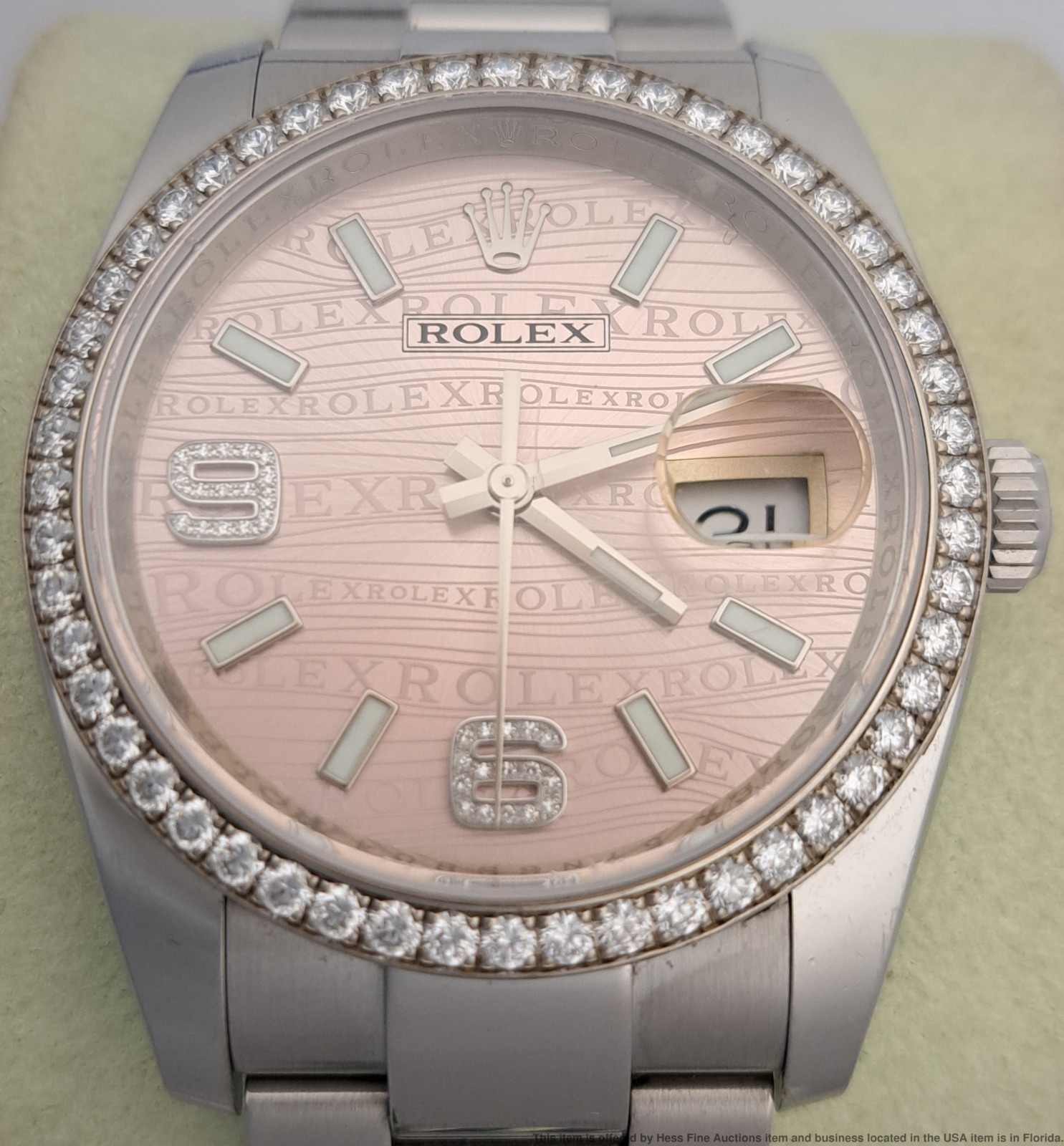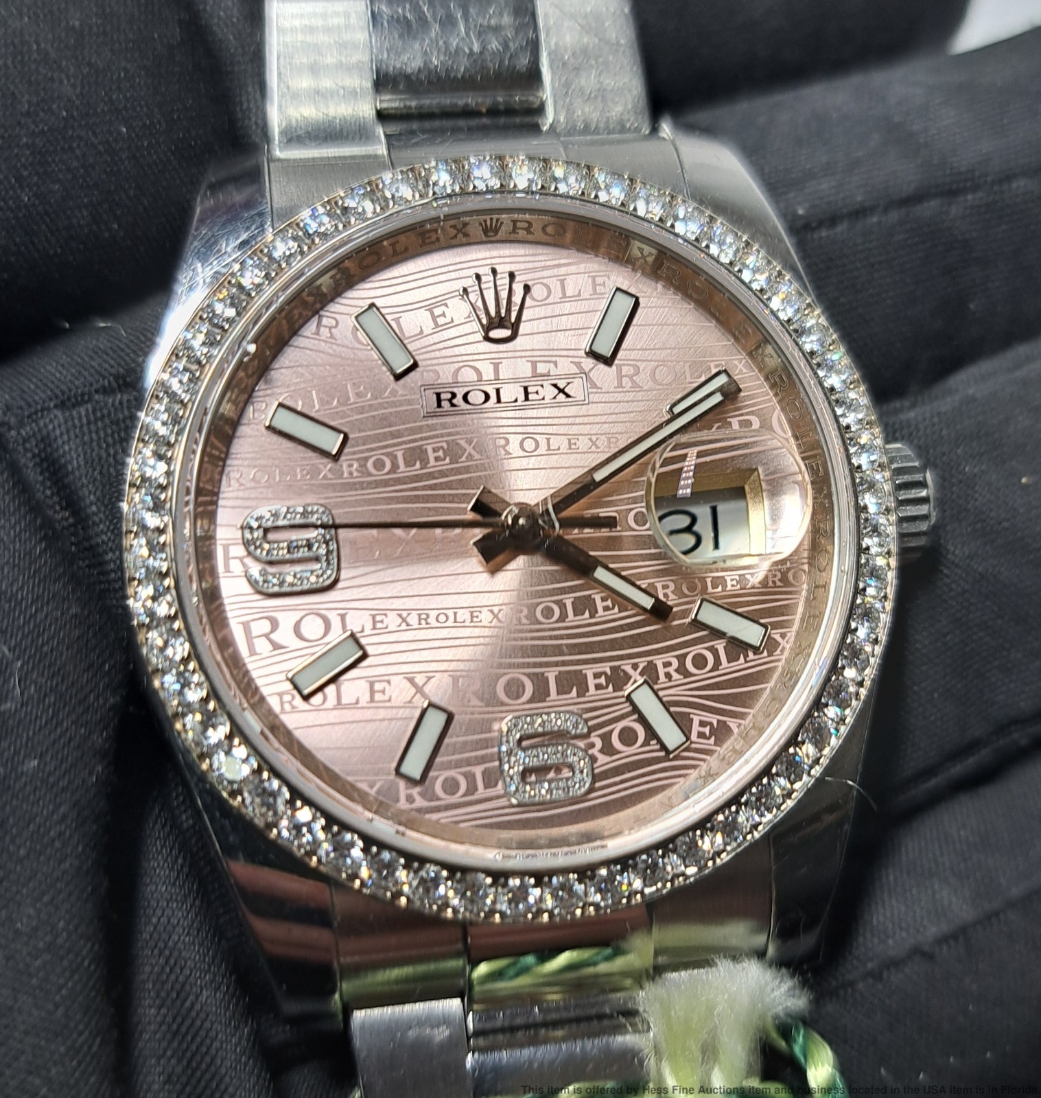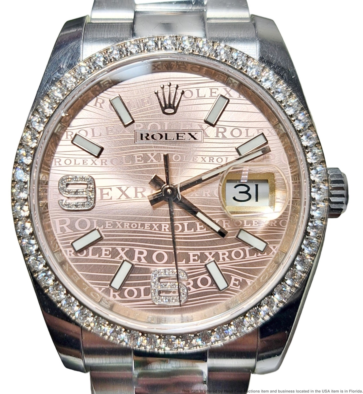 - Described by: Ayanna HFA 56349 NCEDD Title: Rolex OP 116244 Scarce Pink Wave Diamond Dial Wrist Watch Box Papers Tags Description: Rolex OP 116244 Scarce Pink Wave Diamond Dial Wrist Watch Box Papers Tags Serial: 57N69(GMN) Serial will be revealed to the purchaser. Reference: 116244 Year: 2011-2024 Movement Type: Automatic Movement Condition: Movement is running, for optimum timekeeping accuracy we suggest an overhaul at buyers expense Case Width: 36mm Case Thickness: 11.5mm Lug tip to Lug tip: 44mm Inside lugs: 20mm Length or Circumference: 7inches long. Comes w/ extra 13mm link. Weight: 124grams Case Metal: Stainless Steel Case Condition: Displays Surface wear; Nicks and scuffs Bracelet Material: Stainless Steel Bracelet Condition: Displays Surface wear; Nicks and scuffs Clasp or Buckle: Signed Deployant Clasp Crown: Signed screw down Dial Color: Pink Dial Condition: Displays little to no wear Crystal Condition: Nicks along the edges and one near the center. Box & Papers: Comes with inner and outer box, papers and tags. Estimated size of packaging: 8x8x8, 3lbs WILL PAY CASH FOR YOUR WATCHES ONE WATCH OR ENTIRE COLLECTIONS