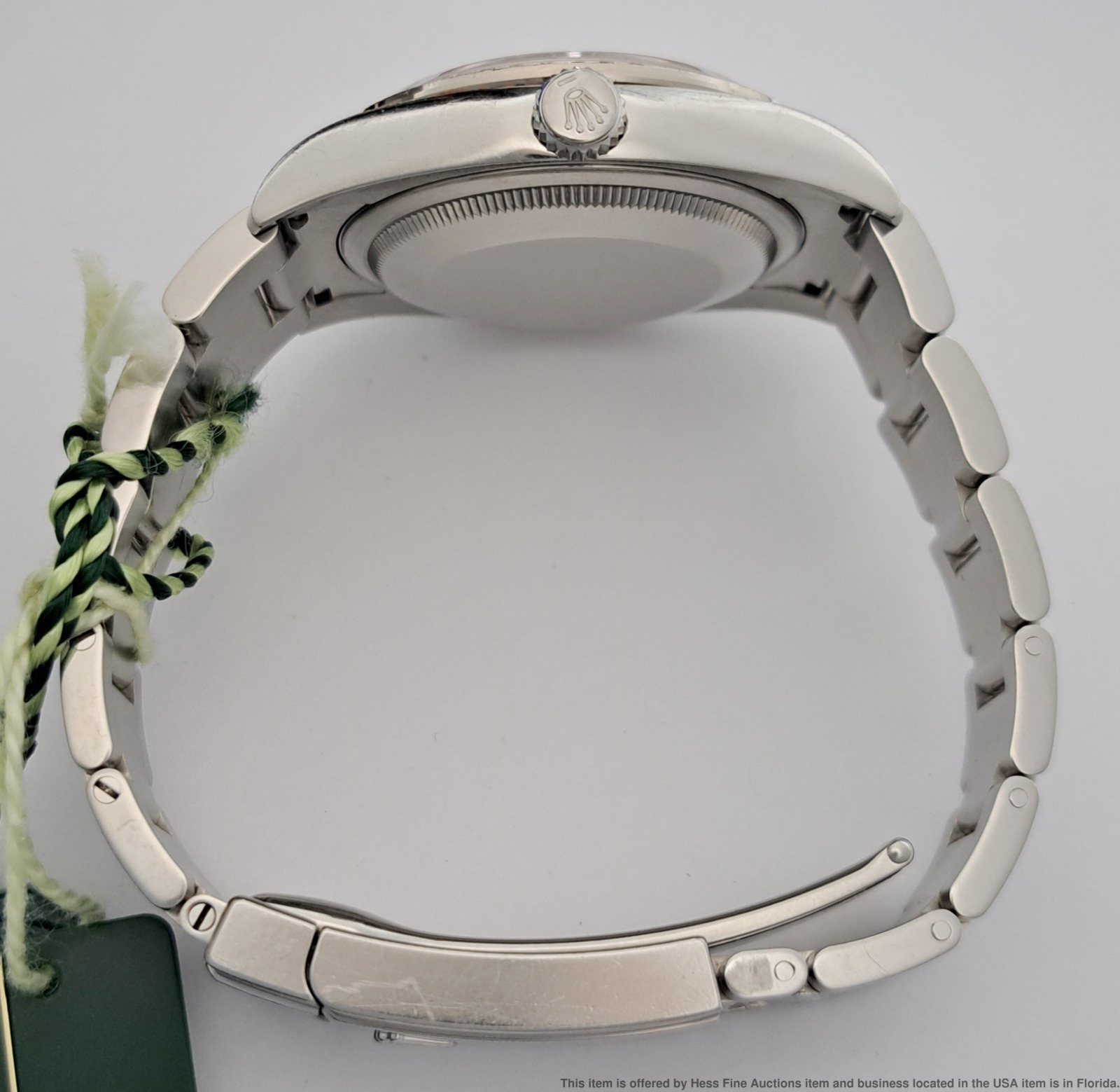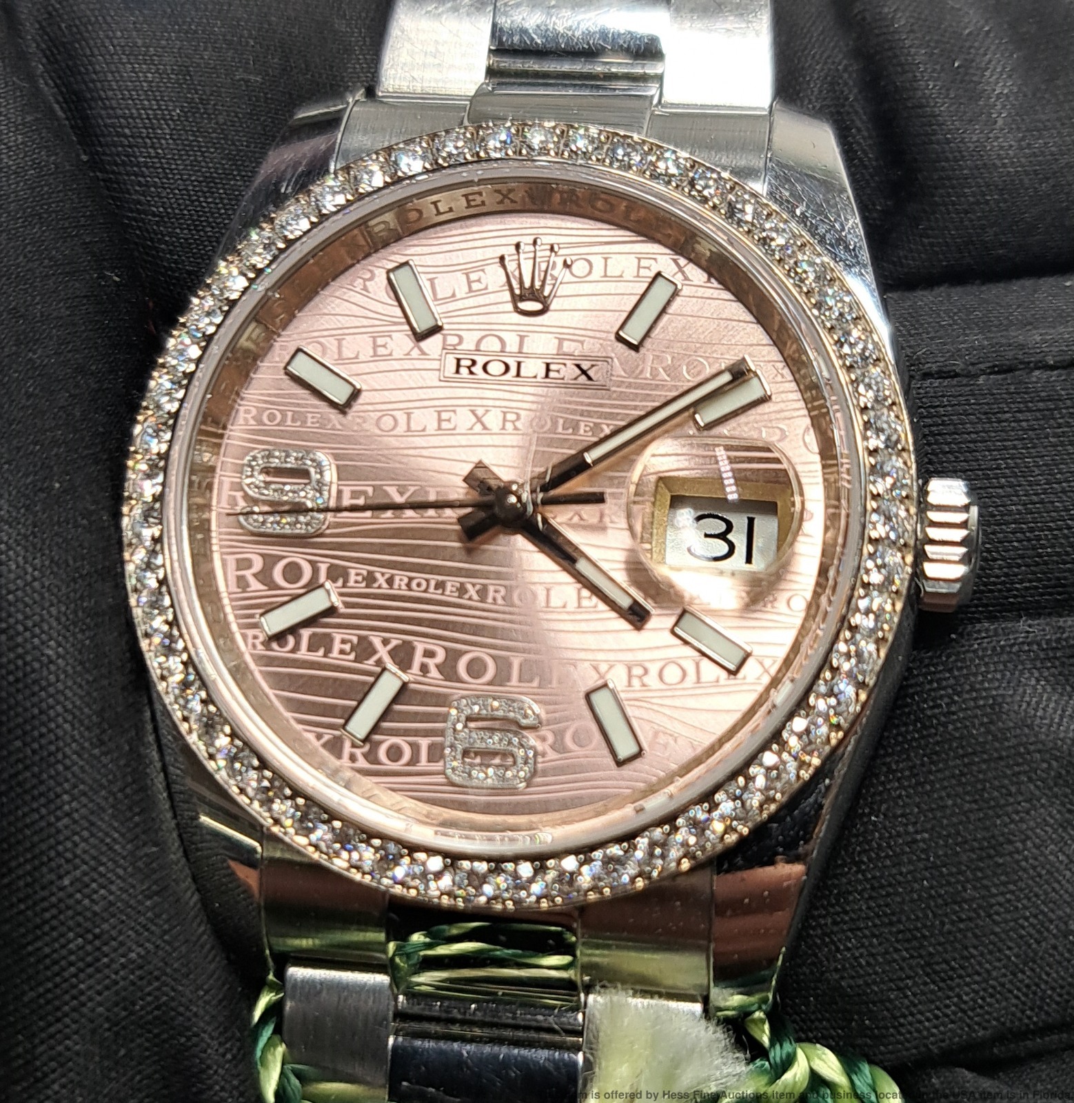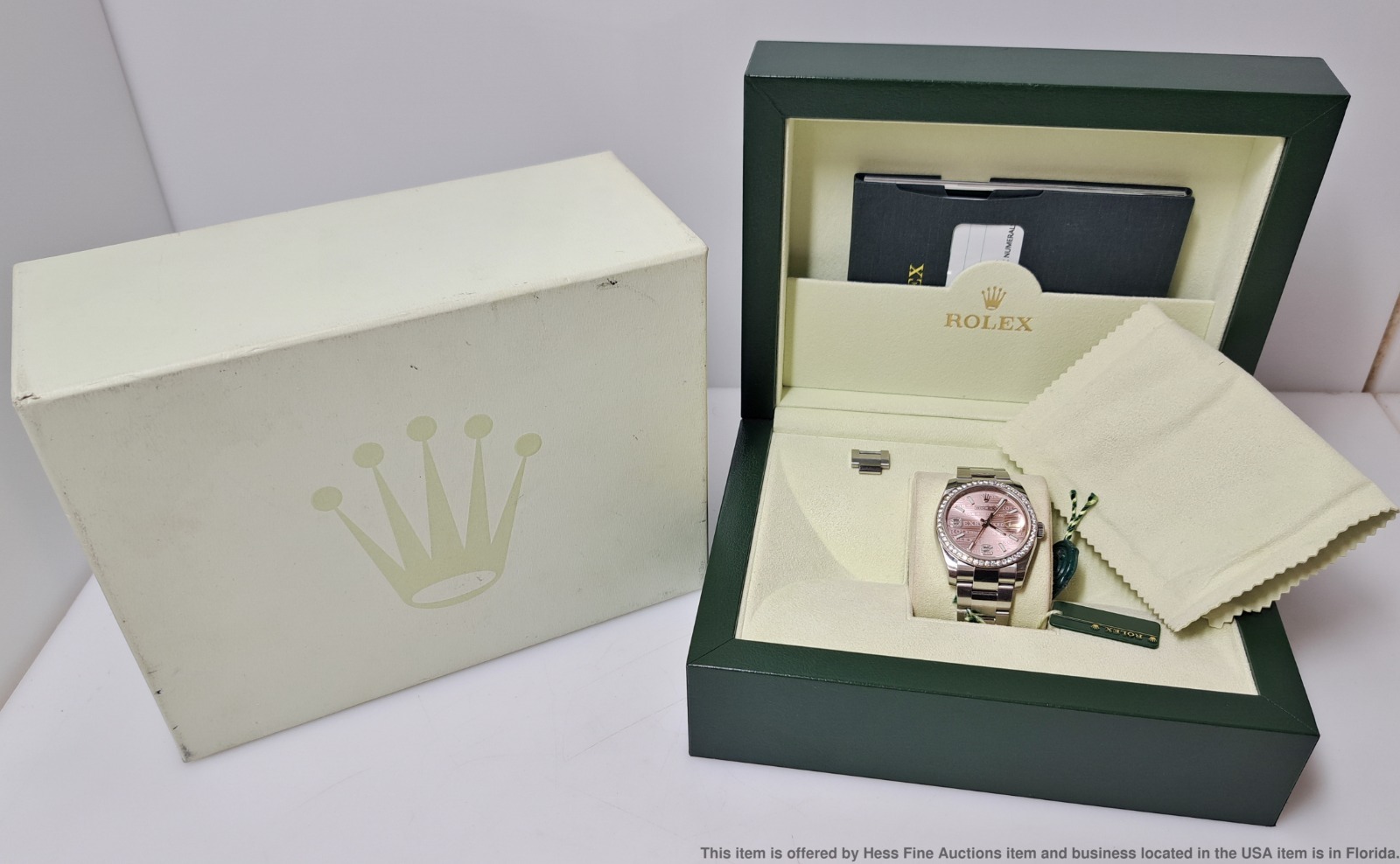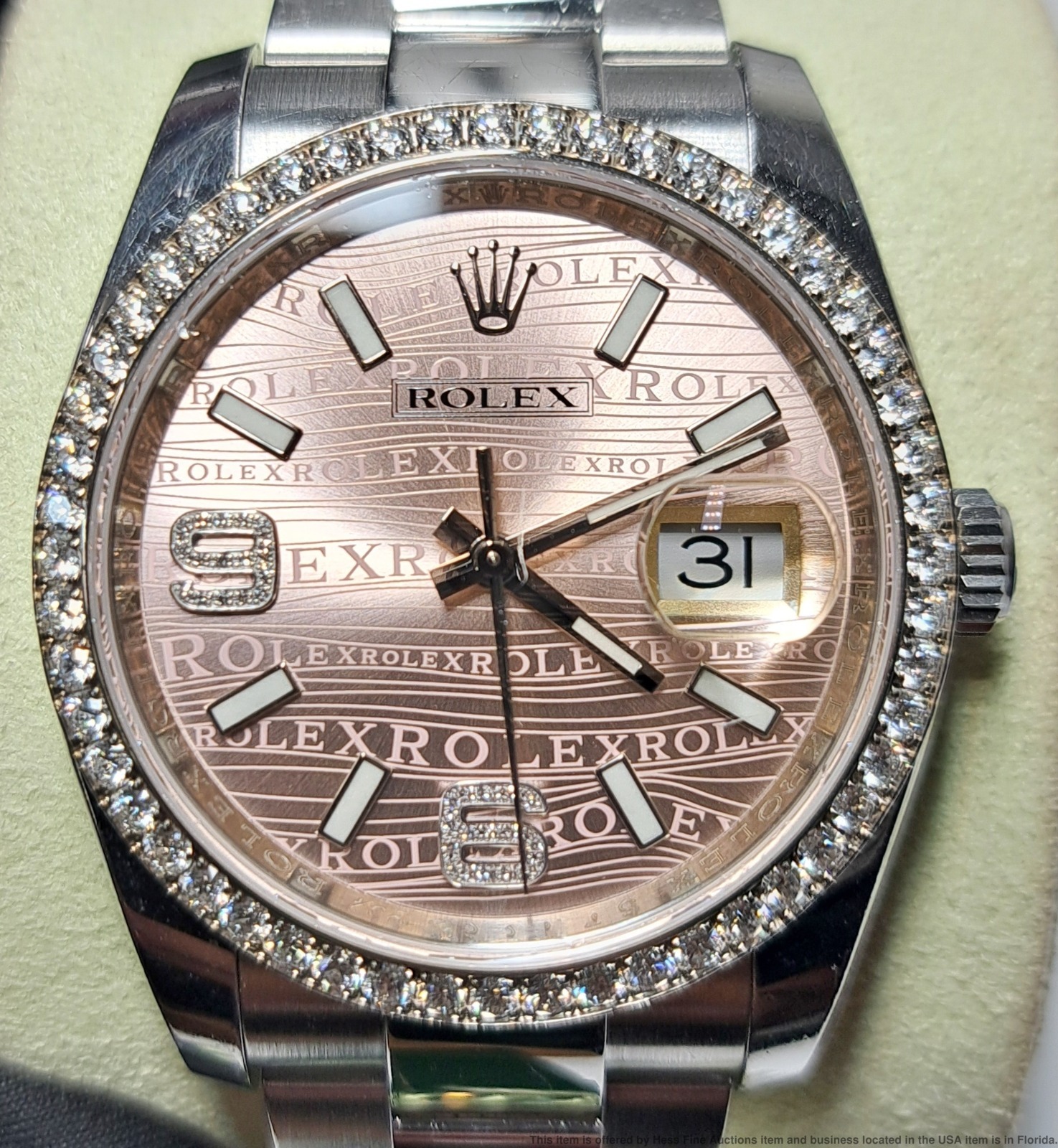 - Described by: Ayanna HFA 56349 NCEDD Title: Rolex OP 116244 Scarce Pink Wave Diamond Dial Wrist Watch Box Papers Tags Description: Rolex OP 116244 Scarce Pink Wave Diamond Dial Wrist Watch Box Papers Tags Serial: 57N69(GMN) Serial will be revealed to the purchaser. Reference: 116244 Year: 2011-2024 Movement Type: Automatic Movement Condition: Movement is running, for optimum timekeeping accuracy we suggest an overhaul at buyers expense Case Width: 36mm Case Thickness: 11.5mm Lug tip to Lug tip: 44mm Inside lugs: 20mm Length or Circumference: 7inches long. Comes w/ extra 13mm link. Weight: 124grams Case Metal: Stainless Steel Case Condition: Displays Surface wear; Nicks and scuffs Bracelet Material: Stainless Steel Bracelet Condition: Displays Surface wear; Nicks and scuffs Clasp or Buckle: Signed Deployant Clasp Crown: Signed screw down Dial Color: Pink Dial Condition: Displays little to no wear Crystal Condition: Nicks along the edges and one near the center. Box & Papers: Comes with inner and outer box, papers and tags. Estimated size of packaging: 8x8x8, 3lbs WILL PAY CASH FOR YOUR WATCHES ONE WATCH OR ENTIRE COLLECTIONS