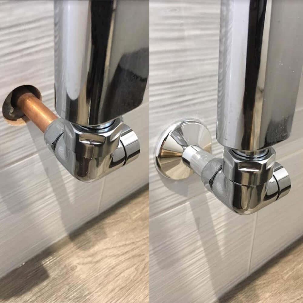 The floor caps discreetly conceal the hole in your floor or wall where the copper pipe emerges, while the pipe sleeves encase the 15mm copper pipe, matching the finish of your chosen radiator valves for a cohesive look. Together, these components deliver a neat, professional appearance by hiding unsightly pipe connections, enhancing the overall aesthetic of your heating setup.