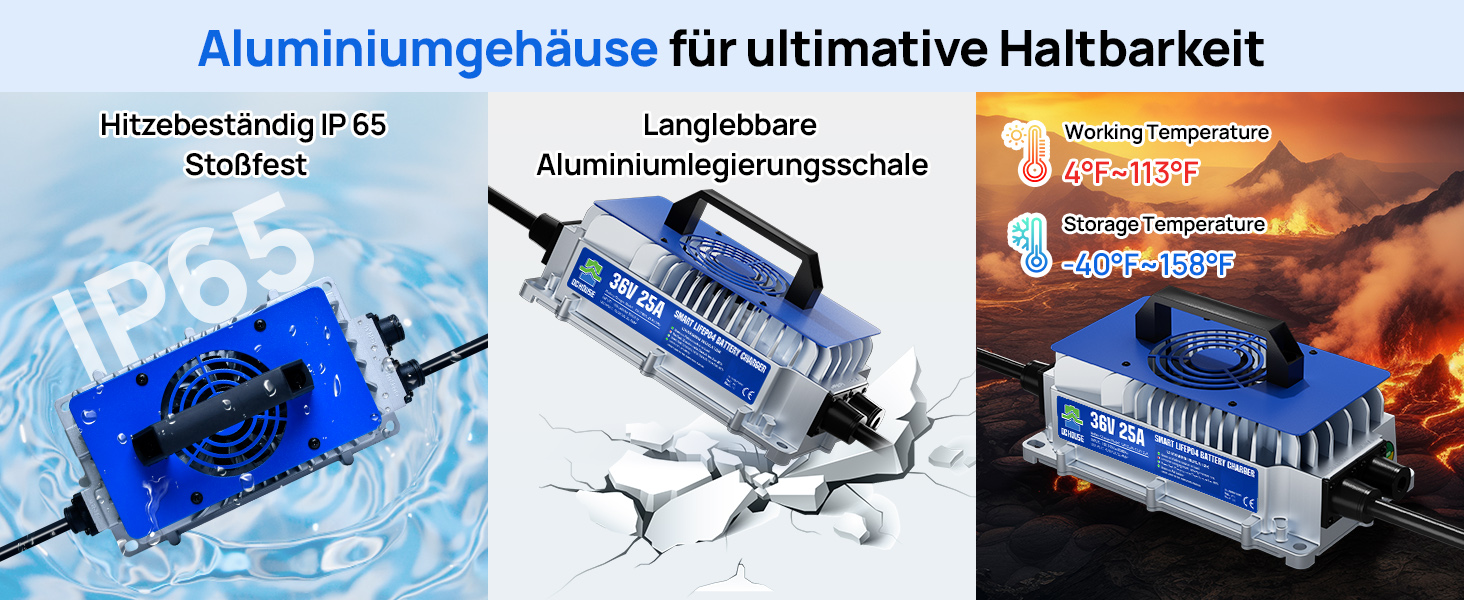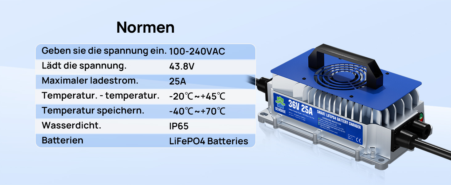 【Designed for Lithium Batteries】: Die maximale Ladespannung des Ladegeräts beträgt 43,8 V. Dies ist eine relativ schnelle und gute Möglichkeit, 36V (38,4V) Lithium-Eisenphosphat-Batterien zu laden. Nenneingangsspannung: 100V - 240VAC, Ladestrom: 25A, Betriebstemperatur: -20℃ - 45℃. Das 36-V-Ladegerät unterstützt die 0-V-Ladefunktion und kann 0-V-Lithiumbatterien reaktivieren.
