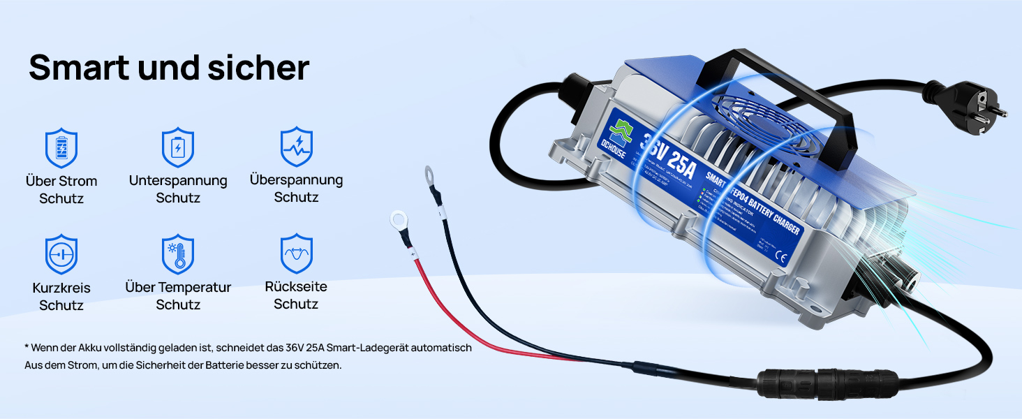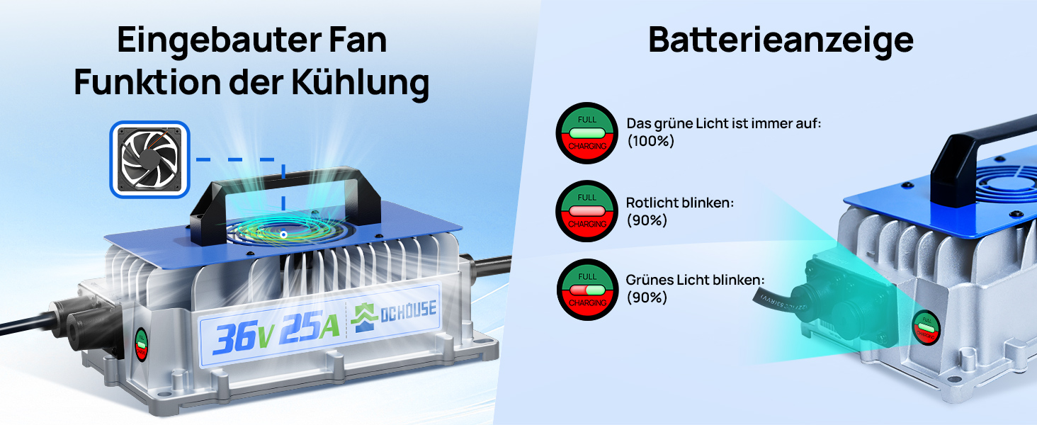 【Mehrfacher Sicherheitsschutz】:36V Lithium-Batterie-Ladegerät Eingang Niederspannung, Überspannungsschutz, Ladegerät Überhitzungsschutz, Ausgang Leerlaufschutz, Ausgang Kurzschluss / Reverse-Verbindung Schutz, Ausgang Überstrom / Überspannung Schutz, automatische Abschaltung nach voll geladen. Eingebautes Kühlgebläse, gute Wärmeableitung während des Ladevorgangs, leicht verständliche Ladeanzeigefunktion.