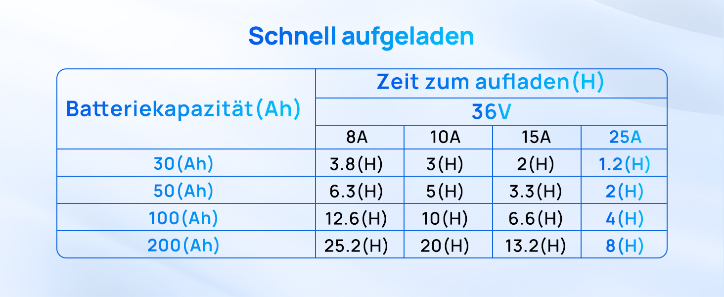 【Schnelles Aufladen】: Mit 25 Ampere Stromstärke und 900W Schnellladegerät, ist die Ladeeffizienz ≥ 93%. Im Vergleich zu anderen 36V 18A Ladegeräten, kann es Ladezeit sparen. Es kann eine 36V 50AH Batterie innerhalb von 2 Stunden und eine 36V 100AH Batterie innerhalb von 4 Stunden vollständig aufladen. Darüber hinaus ist es für verschiedene Geräte mit 36V-Lithiumbatterie geeignet, wie z.B. Besichtigungsfahrzeuge, Gabelstapler, Logistikfahrzeuge, Geländewagen und Boote, und erfüllt deren zyklische Ladeanforderungen