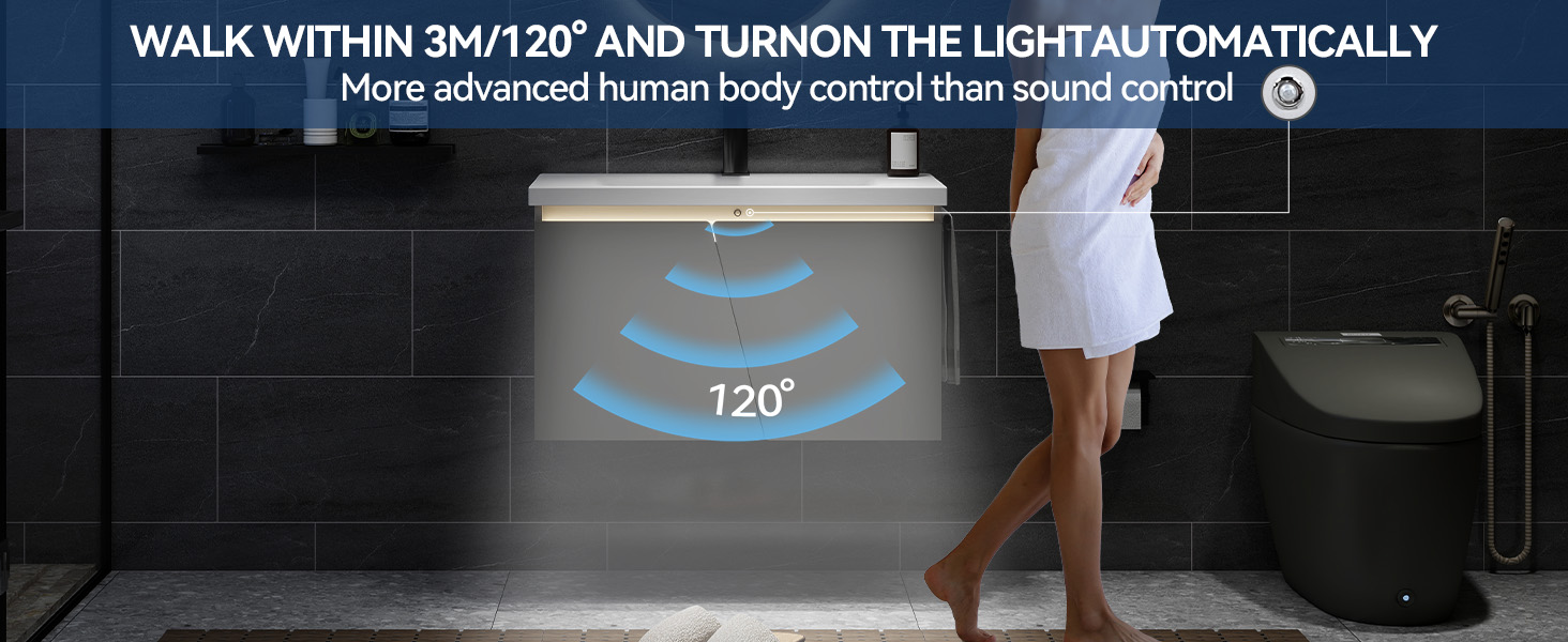 This bathroom vanity cabinet equipped with smart sensor light can automatically turn on when you are 10ft/120°away from this bathroom furniture, and turn off after 22s without human activity. Providing safety and energy saving.