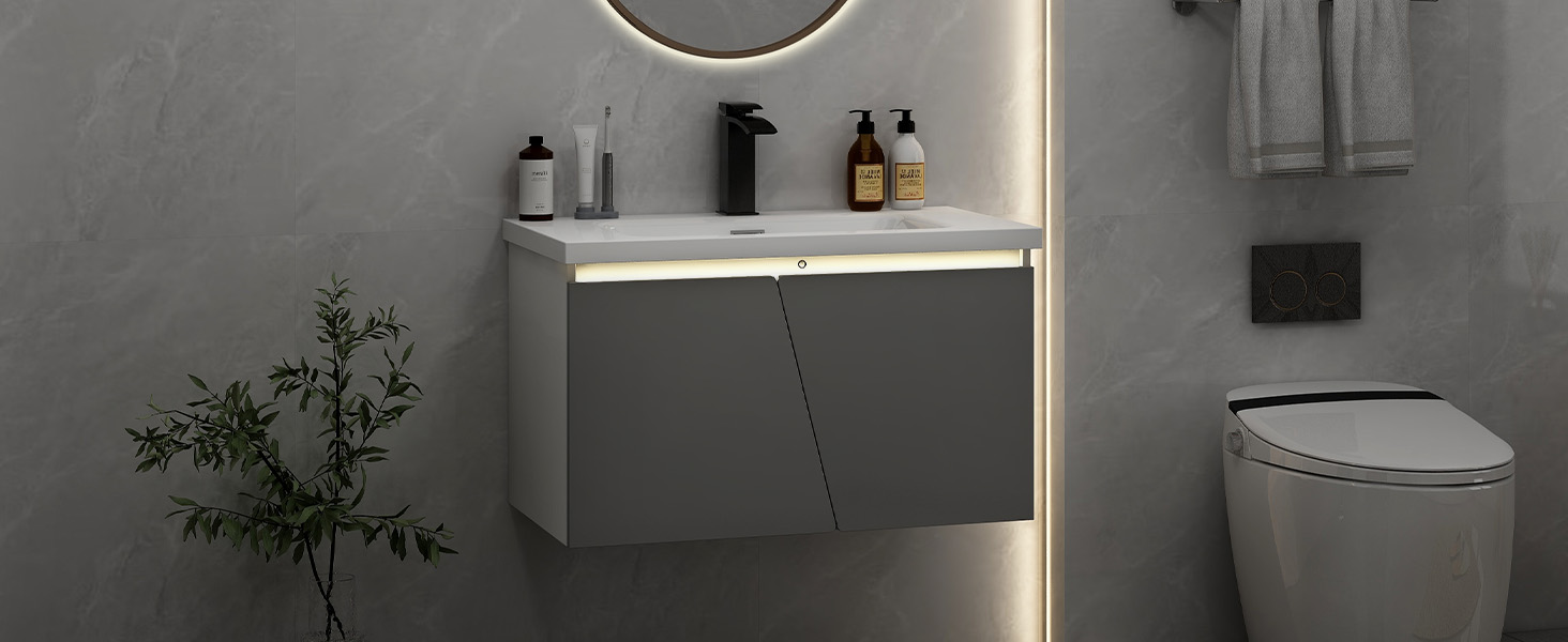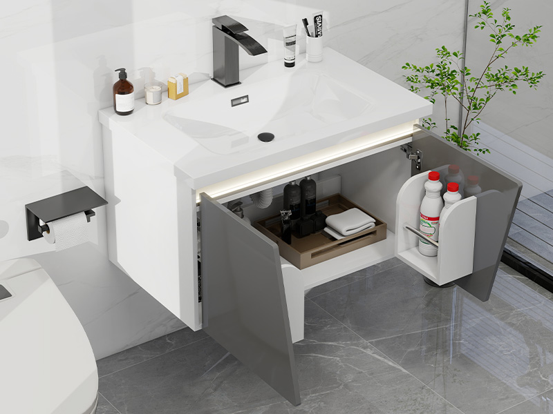 Wall-mounted design provides an extra area to store cleaning supplies and solves the cleaning of dead angles on the floor, advioding moisture and cracking at the bottom of the cabinet.