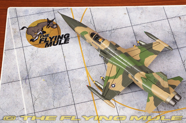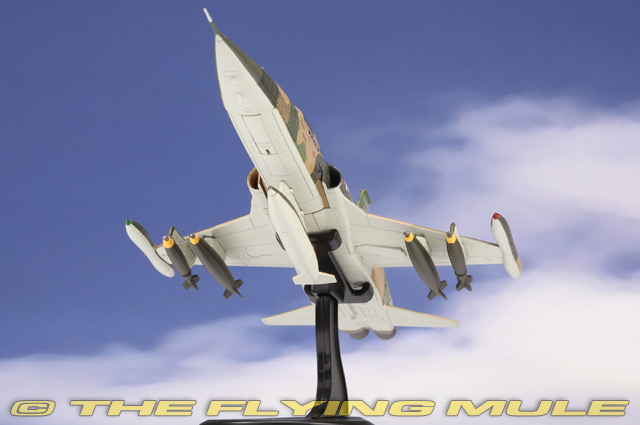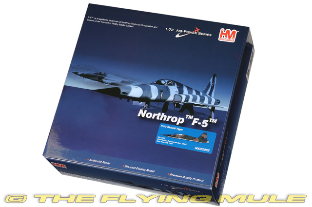 In the mid-1960s, the U.S. Air Force's 10th Fighter Commando Squadron (FCS) played a critical role in Project "Skoshi Tiger," an experimental program deploying the F-5 Freedom Fighter to Vietnam. The squadron tested the F-5's combat effectiveness under real-world conditions, operating from Bien Hoa Air Base. These compact, agile jets conducted close air support, interdiction, and ground-attack missions, often in high-risk areas. Skoshi Tiger was designed to assess the F-5's potential as an affordable, exportable fighter for allied nations. The 10th FCS demonstrated the F-5's capability, paving the way for its adoption by numerous U.S. allies worldwide. Northrop F-5C Skoshi TigerDesigned partly to meet a US Navy requirement for a low-cost, low-maintenance fighter to operate from Escort Carriers, the F-5 first flew on July 30, 1959. Development of the F-5 continued even after the Navy withdrew its Escort Carriers, and the aircraft eventually evolved into the light, supersonic "Freedom Fighter," serving US allies during the Cold War and as a supersonic trainer in the US. The second-generation F-5 ("Tiger II") also served US allies, but because it was small and maneuverable like a MiG it was also used by the US military as a training and "aggressor" aircraft, acting as the opposing force during military wargames.© Copyright 2003-2026 The Flying Mule, Inc. Hobby Master's 1:72 scale F-5 Tiger II is a sleek and fast looking model that uses a clever mix of metal and plastic components with near-seamless construction. The solid metal wing has sharp-edged plastic leading edge root extensions appropriate to the variant being modeled. The removable canopy provides a clear view of the cockpit's interior features such as the pad-printed front and side mounted instrument panels. Landing gear and doors have been included as one piece sub-assemblies that allow for quick and easy configuration for ground display. The series covers both fighter variants with optional ordnance configurations (see photos) and the long nose reconnaissance variant. © Copyright 2003-2026 The Flying Mule, Inc. Hobby Master 1:72 Air Power SeriesThe Hobby Master "1:72 Air Power Series" range presents detailed, ready-made diecast models of military aircraft.Hobby Master "1:72 Air Power Series" diecast airplanes feature: