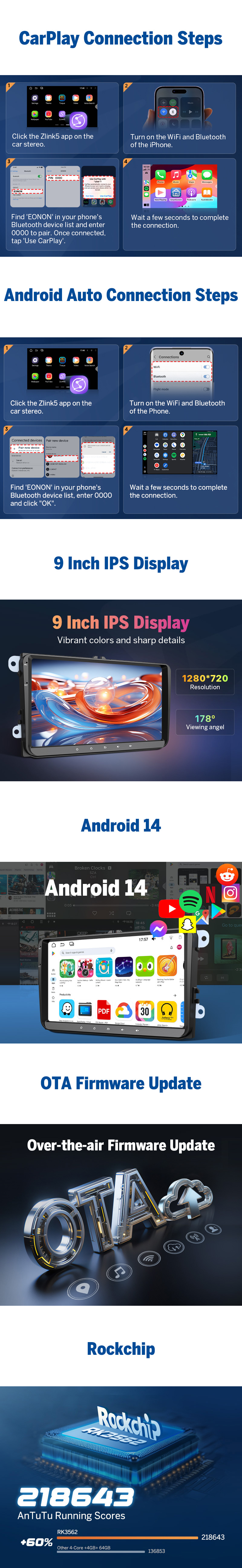 4GB RAM + 64GB ROM | Wireless Apple CarPlay & Android Auto | 9" IPS HD Touchscreen | DSP Audio | Built-in GPS | WiFi 6 | Bluetooth 5.4 | OTA Updates