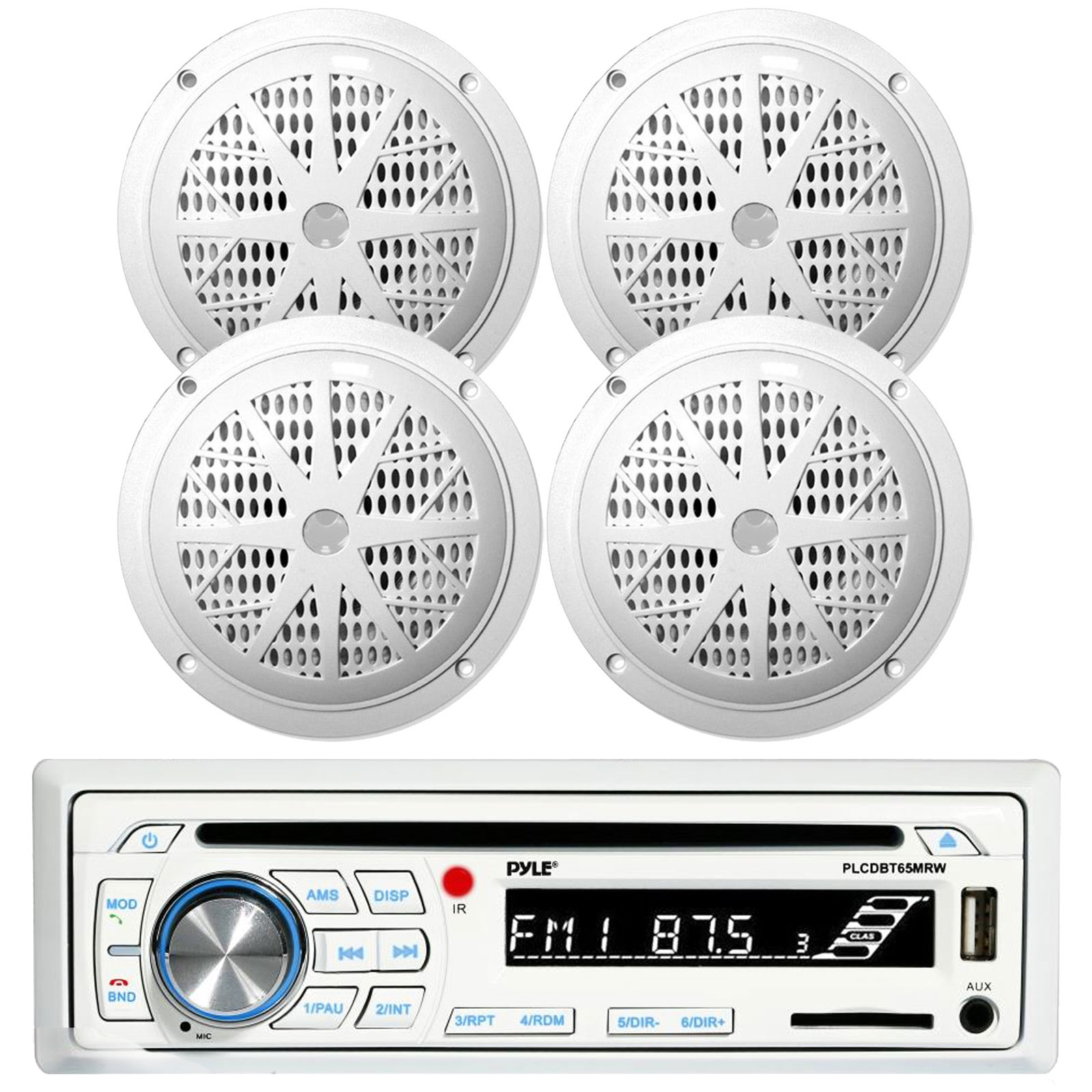 Pyle PLCDBT65 Single DIN Marine AM/FM Stereo Bluetooth CD Player Receiver with 4 X Pyle 6.5" 120 Watt White Marine Speakers