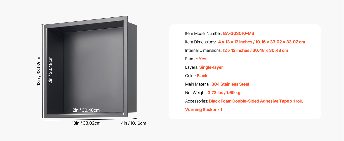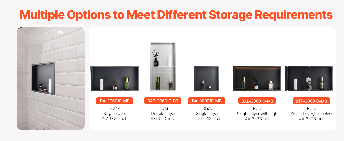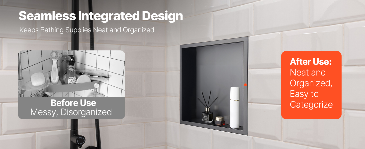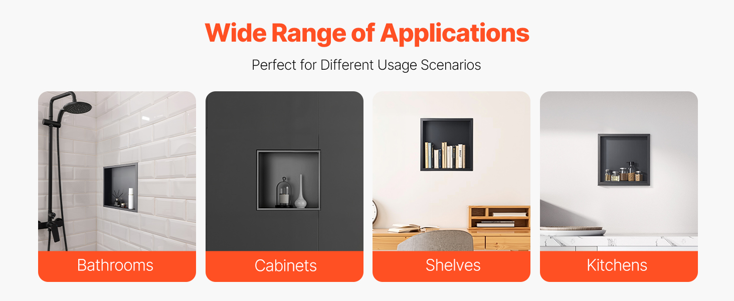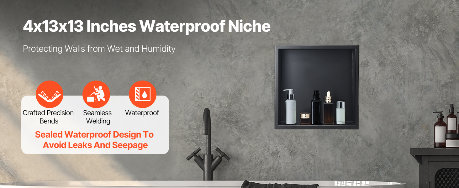 VEVOR shower niche, made of 304 stainless steel, is 100% sealed and waterproof with a corrosion-resistant, easy-to-clean, scratch-resistant coating. It features a pre-installed hollow shelf to prevent water accumulation, perfect for bathrooms, cabinets, and kitchens.