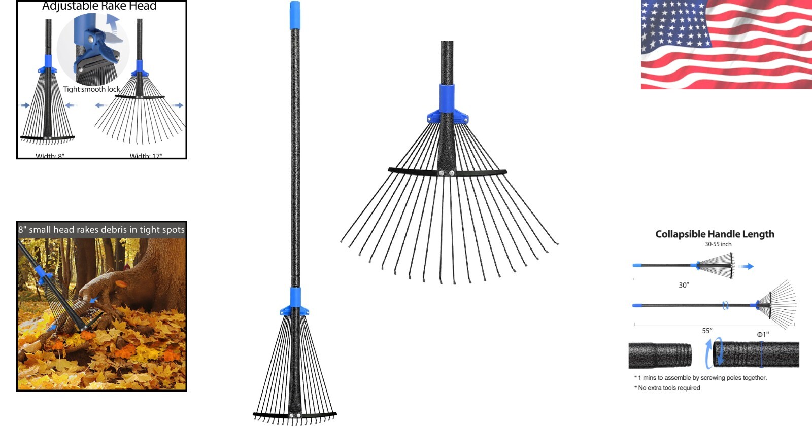 Elevate your gardening experience with our Collapsible Garden Rake, designed for durability and efficiency. Its innovative expandable head allows you to customize the rake width from a narrow 8" to a robust 17" in seconds, making it adaptable to any task. No more struggling with hard-to- areas or large piles of leaves; our rake does the hard work for you.