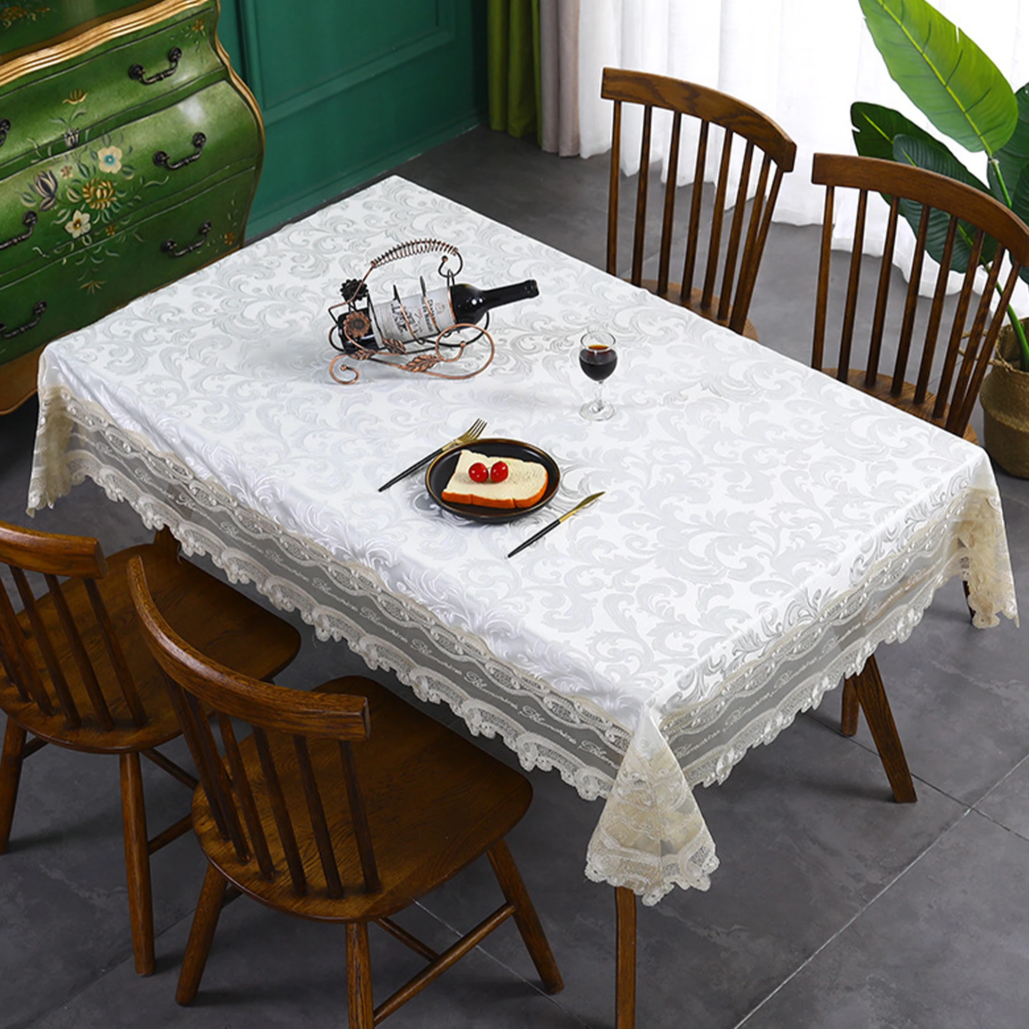 Floral Lace Edges Design: Well-made Textured Fabric Table Cloth with romantic heavyweight macrame lace border. This linen table burlap is designed to keep dust and dirt from settling on your tablecloth.