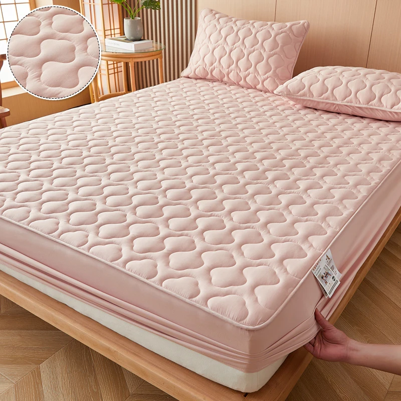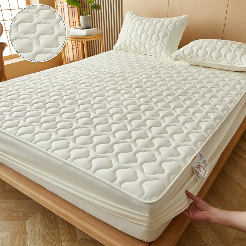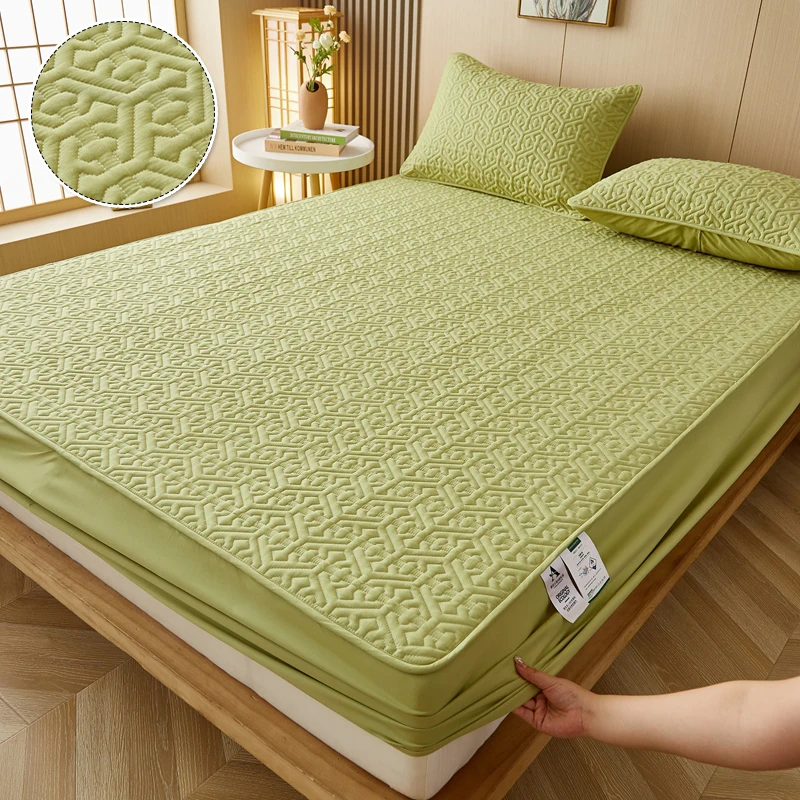 1: We have two different types of fabrics. One is jacquard fabric, and the other is waterproof fabric. We have detailed specifications on them, please purchase according to your needs. For example, if you need jacquard fabric, please purchase a color name with jacquard as needed. In addition, if you purchase this fitted sheet, there is only one bedspread and it does not include a pillowcase. If you need pillowcases, please click on the purchase link below.