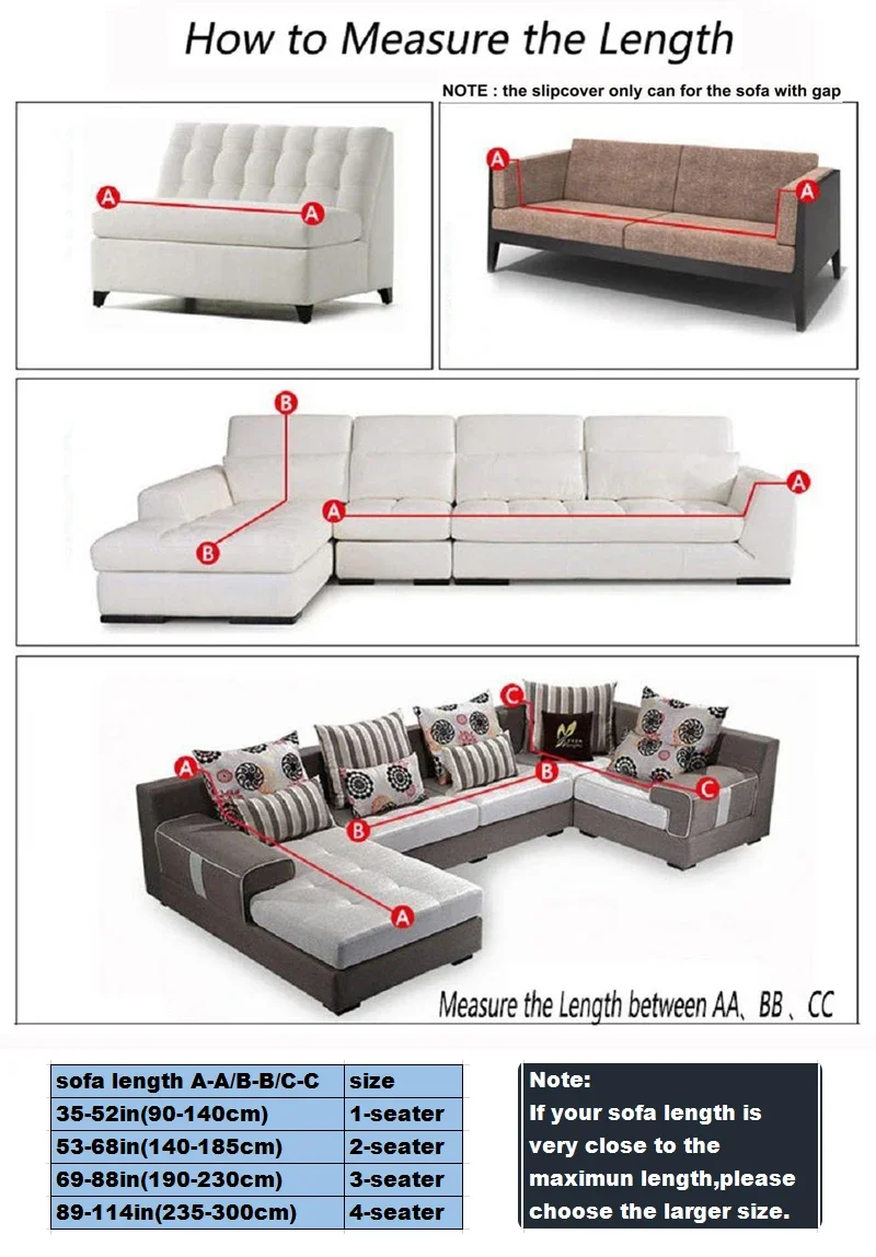 For example: If AA=200 cm, BB=160 cm, then you should go for 1 PC three-seater sofa cover and 1 PC two-seater sofa cover.