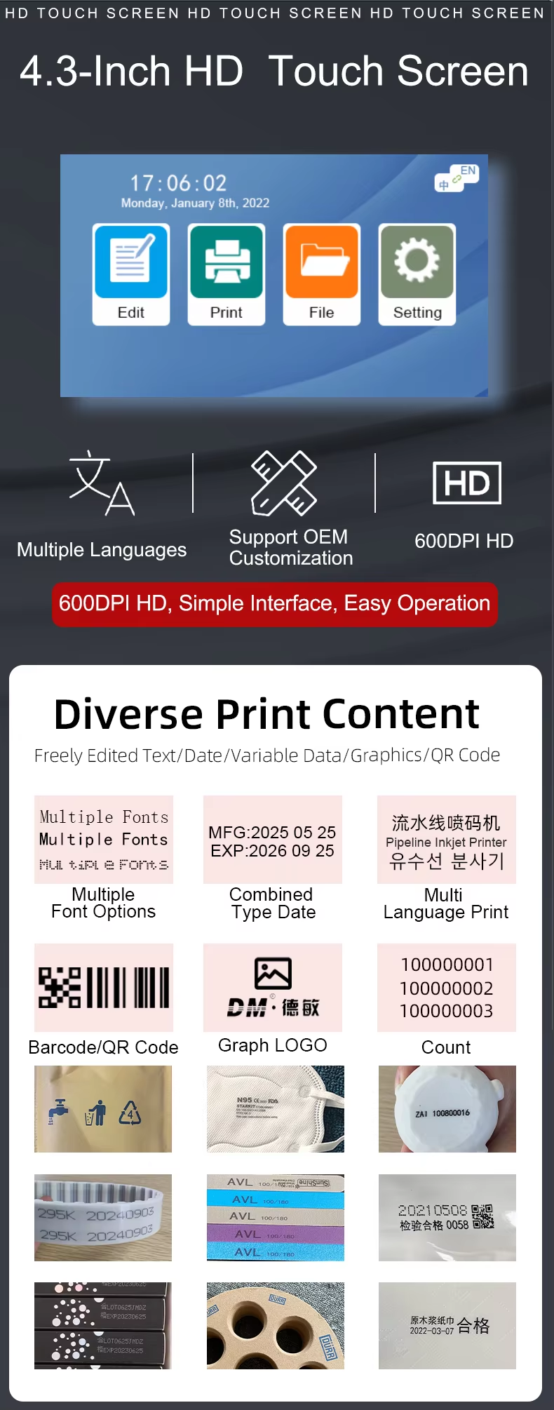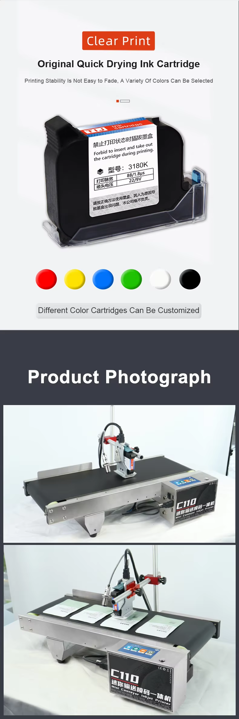 A:You can print date, text, logo, variable data, batch number, QR code, serial number and other content. Red, yellow, blue, green, black, white and other colors are available.