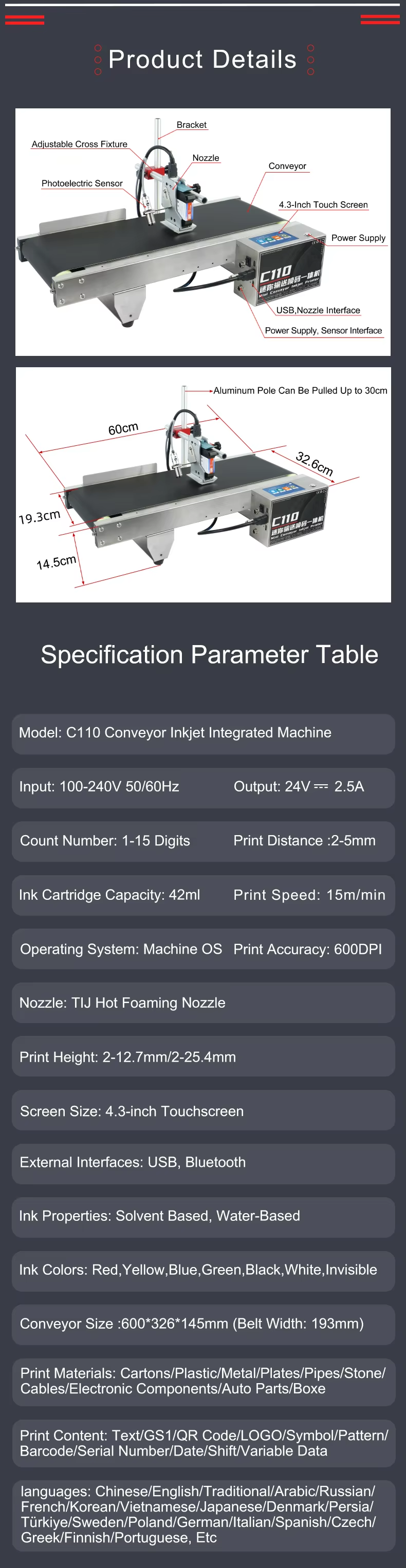 Our main business is: TIJ inkjet printers, CIJ inkjet printers, UV inkjet printers, laser inkjet printers, conveying equipment, accessories and consumables and other products, products are widely used in printing, electronics, plastics, hardware, food and beverage, medicine, cosmetics, tobacco, wood, auto parts, cables and building materials and other fields. At present, we have cooperated with more than 100 countries and regions, including Italy, Spain, the United States, Canada, Mexico, Russia, Vietnam, Thailand and so on. We always adhere to the customer first, continuous innovation and upgrading, and strive to provide all customers with the best products and services, committed to becoming the most reliable supplier!