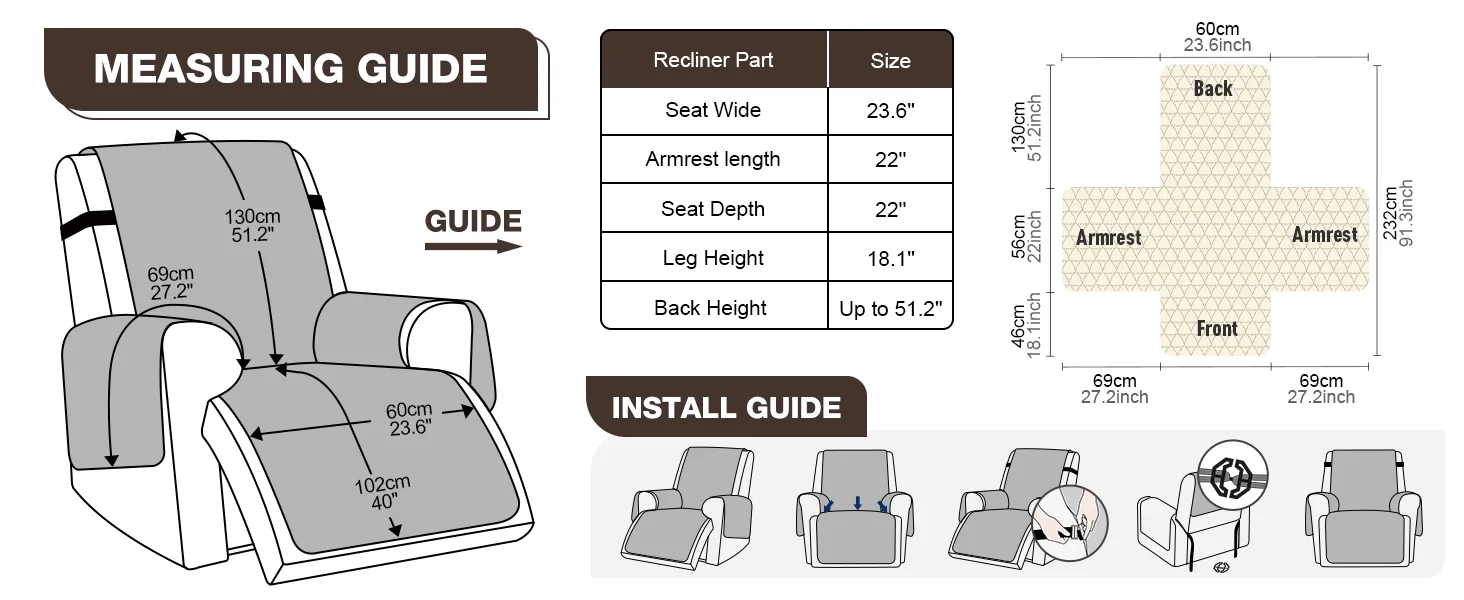 【DIMENSIONS GUIDE】Small pet recliner cover fit a chair with a seat width of 23.6 in, see measurement guide in photos. NOTE: Please confirm the size before purchasing. (Due to some lighting reasons, the color of each display will be different, so please refer to the actual color)