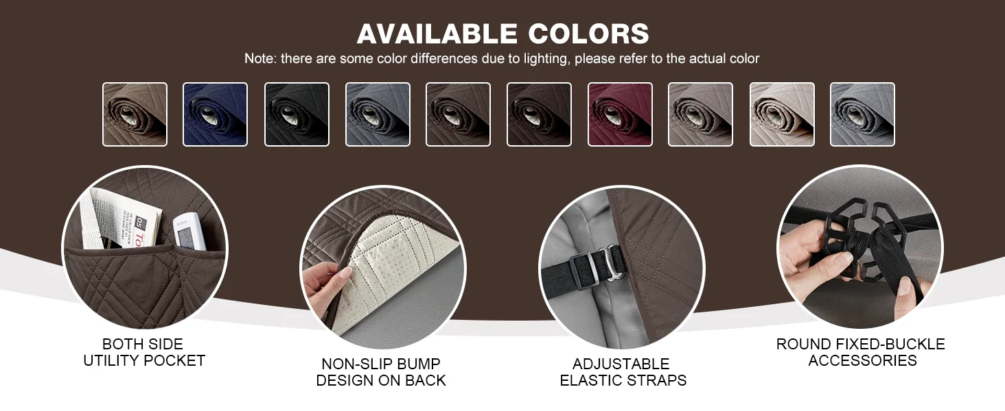【REDUCE SLIP-OFF CONCEPT】Reduce movement around! 1. Solid round colloid design on the back of our recliner cover; 2. Additional flexible elastic straps; 3. Two elastic bands at seat's back side and the matching buckle, to reduce the sliding of the recliner chair slipcover, even on the leather furnitures