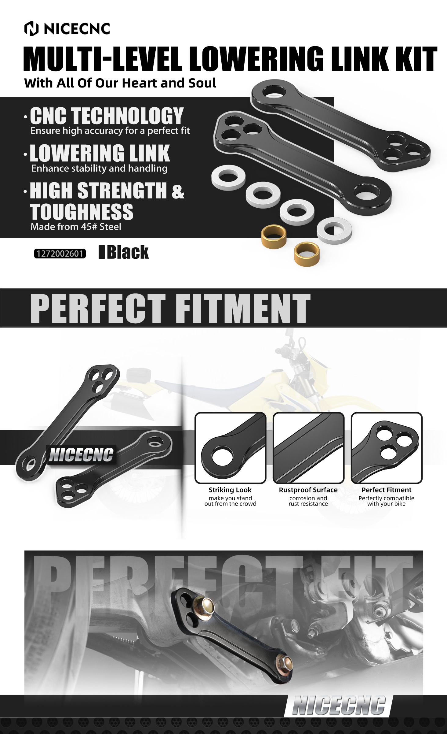 【Structure réglable】 Modification de l’angle d’amortissement de la suspension au moyen d’un réglage neutre, permettant aux cyclistes d’abaisser la hauteur du siège à un niveau plus gérable. 【Stabilité améliorée】 L’abaissement du vélo peut améliorer la stabilité et la maniabilité, ce qui permet aux cyclistes de poser plus facilement leurs pieds à plat sur le sol lorsqu’ils sont arrêtés. 【Confort amélioré】 Avec une hauteur de selle plus basse, les cyclistes peuvent bénéficier d’un confort accru, en particulier lors de longs trajets. 【Technologie CNC】 Usiné par une technologie CNC de pointe, la précision de chaque pièce de coupe garantit une installation plus facile. 【Haute résistance et ténacité】 Fabriqué en acier 45 #, super léger avec une grande résistance et durabilité. Fondée en 2010, NiceCNC est la première marque mondiale axée sur une grande variété de pièces de moto/voiture/VTT/UTV de course de haute qualité pour nos clients. Depuis une décennie, nos produits ont atteint plus de 100 pays, au service de près de 1000 000 clients. Nos entrepôts à l’étranger sont répartis dans le monde entier afin de permettre une livraison rapide. Spécification -- Marque : NICECNC -- État : 100 % neuf -- Matériel : Acier 45 # -- Traitement : usiné CNC -- Niveau d’abaissement : Crosse, 1,5 », 3 » -- Couleur : Noir Emballage inclus 1 x kit de liaison d’abaissement à plusieurs niveaux Raccord Pour Suzuki DRZ400/E/S/SM 2000-2024 DISCLAIMER
