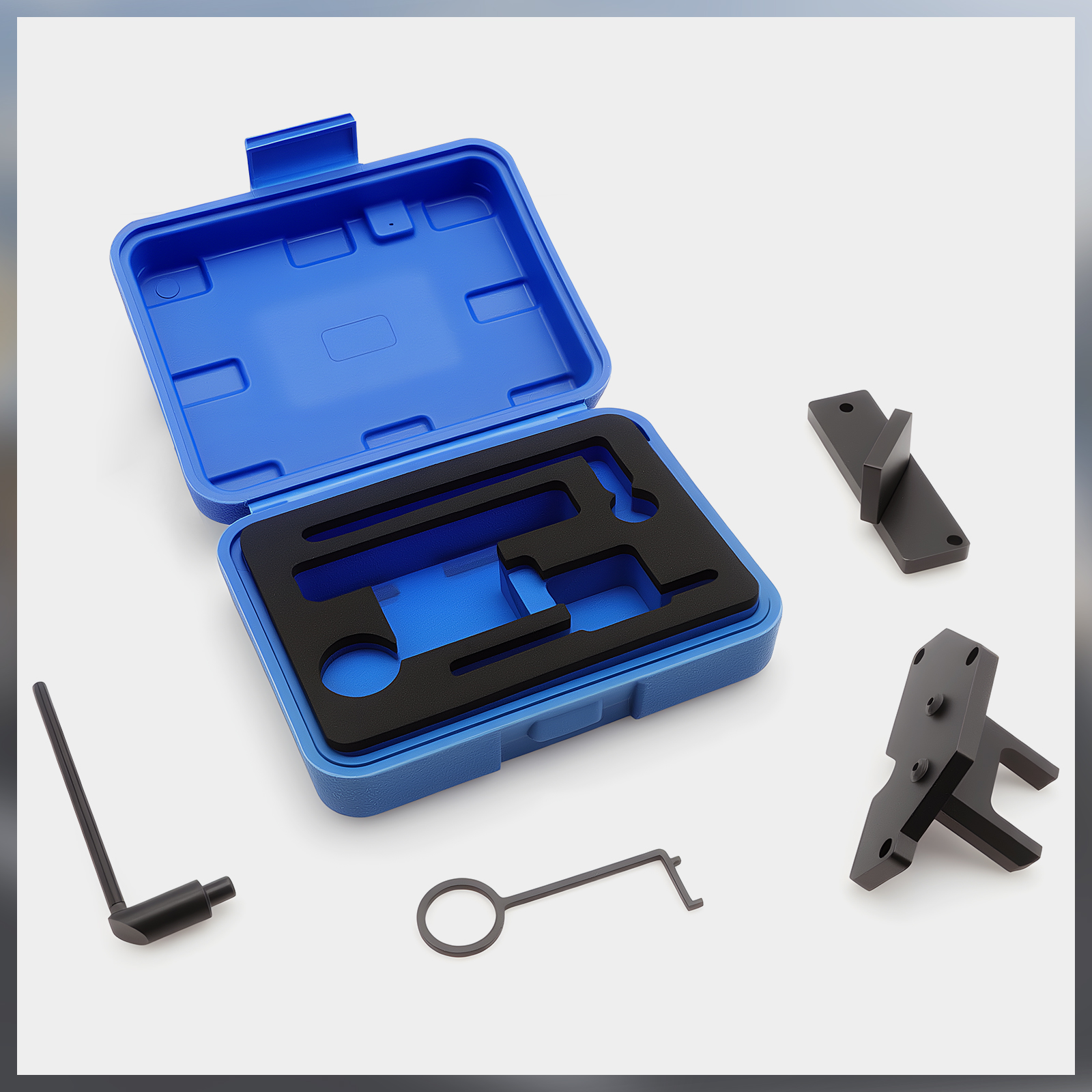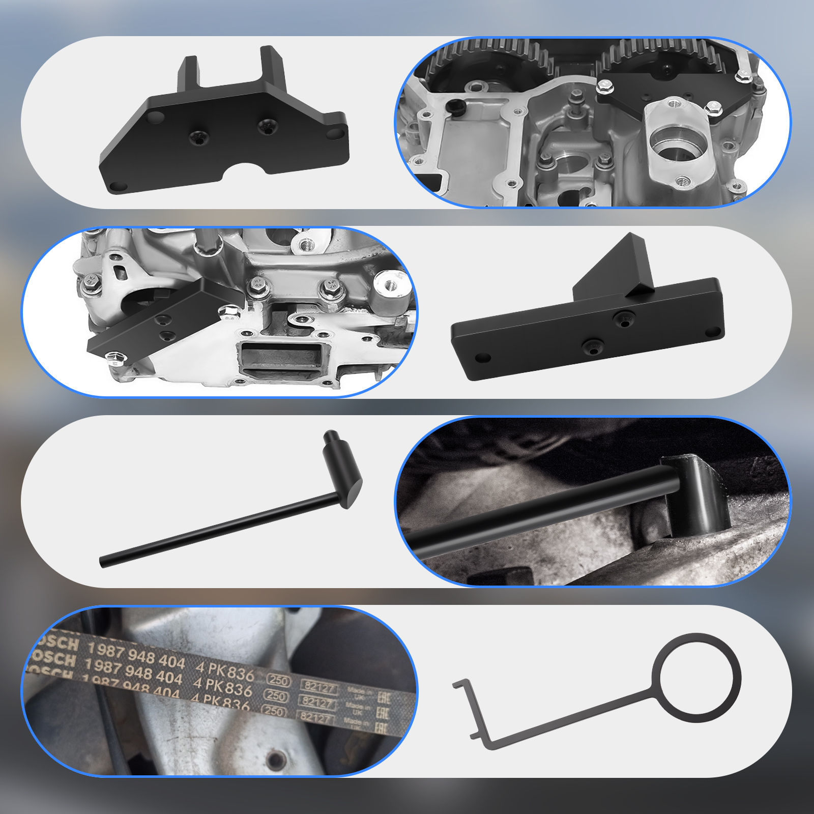 [Application]: The engine timing tool set is used to lock the camshaft and crankshaft for quick removal and replacement of timing belts