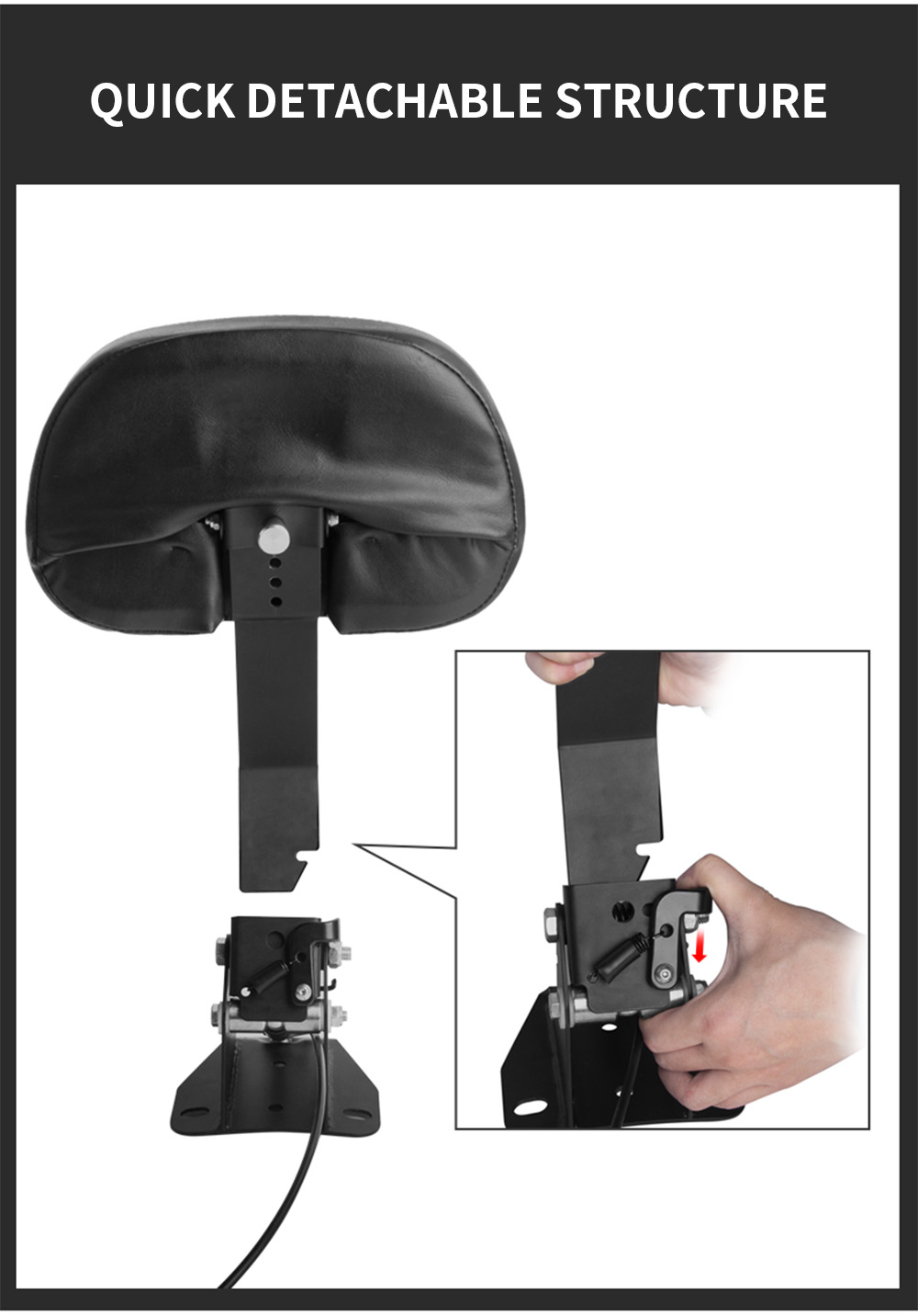 Compatibility and Installation •Specially designed buckle for dedicated vehicles, perfectly matching the original seat structure of the Road Glide/Street Glide from 2009 to 2025. •Reserved screw holes on the bracket, no need to modify the vehicle body, installation can be completed within 10 minutes.