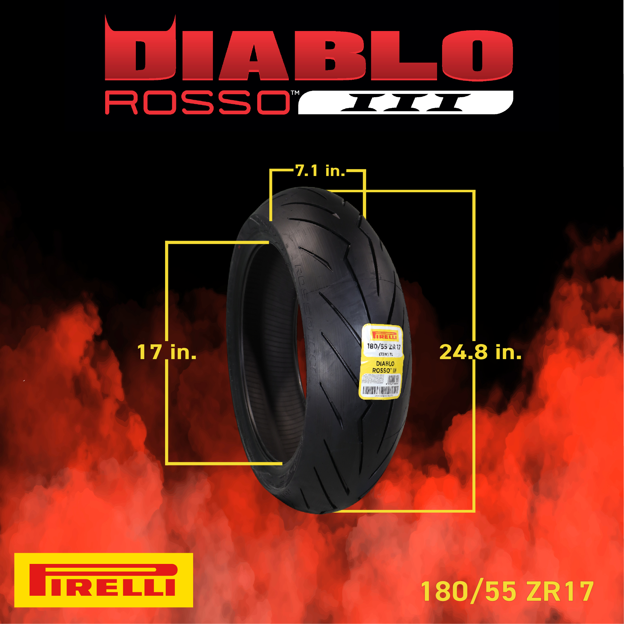 Introducing the DIABLO ROSSO™III, a motorcycle tire that offers unparalleled handling, absolute grip, and exceptional performance in wet conditions. Designed to provide lasting and consistent performance throughout the entire lifecycle of the tire, the DIABLO ROSSO™III is the perfect choice for riders who demand the very best in terms of safety and performance.Drawing inspiration from the highly regarded competition tire DIABLO™ Supercorsa, the DIABLO ROSSO™III features a tread pattern that is both distinctive and effective. The grooves on the tread are designed with a unique "flash" pattern, which not only adds to the tire's competitive edge but also helps to disperse water, making it an extremely safe and high-performance tire in wet conditions. As a testament to the excellence of the Pirelli brand in the motorcycle tire industry, the DIABLO™ represents 13 years of experience, technology, and victories in prestigious tests and competitions. It is no wonder that top bike manufacturers consistently choose the DIABLO™ as original equipment, and that all Diablo-marked products are considered a reference by the most acclaimed international magazines. In summary, the DIABLO ROSSO™III is a tire that offers exceptional handling, absolute grip, and outstanding performance in wet conditions. With its unique tread pattern and proven track record of excellence, the Diablo Rosso 3 is the perfect choice for riders who demand the absolute best in terms of safety and performance.| SIZE | 110/70-17 180/55-17 |