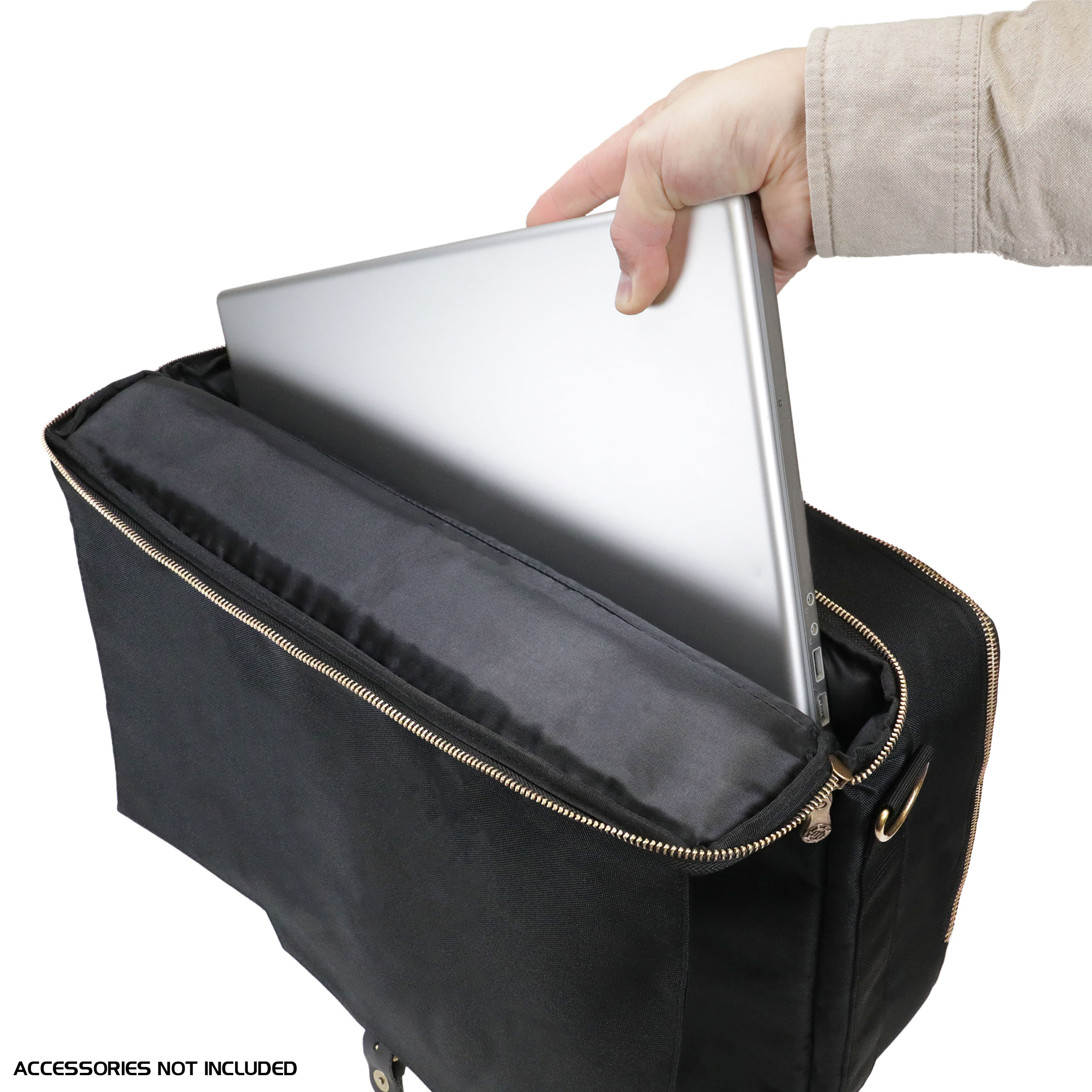 The rear of the shoulder bag is a specifically designed binder/laptop compartment to travel with ease. With an interior measuring in 17.3 x 14.2 x 2.8 inches, it can fit larger top loader binders or smaller multiple card binders. With reinforced padded walls, it will protect your binder or laptop with security.