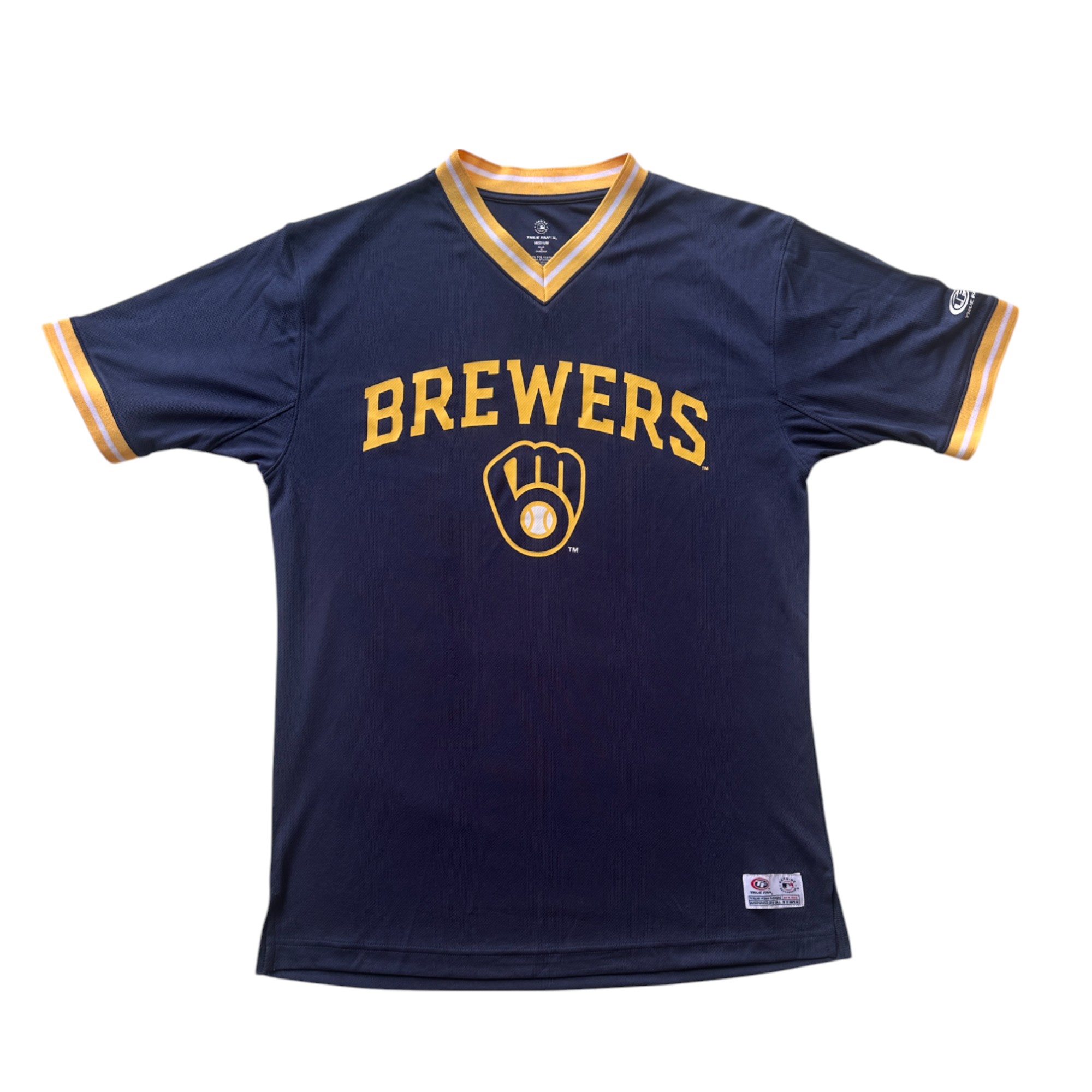Be ready for game day in this officially licensed MLB team apparel for men. The pullover style baseball jersey comes in Brewers team colors and graphics. The sporty baseball team's v-neckline and sleeves are accented in team stripes. The short sleeve jersey shirt is made with a lightweight and breathable 100% Polyester material that's machine washable. The Cooperstown Collection shirt is a men's size medium. Measurements: 20" chest, 9.5" sleeve length, 29" length.