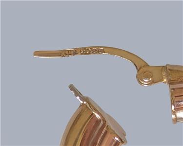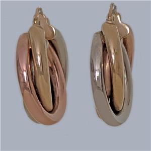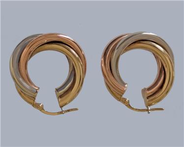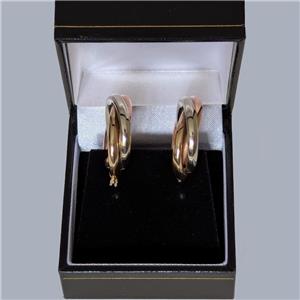 A timeless pair of Cartier-style hoop earrings, beautifully crafted in an elegant trio of interwoven 9ct yellow, white, and rose gold.