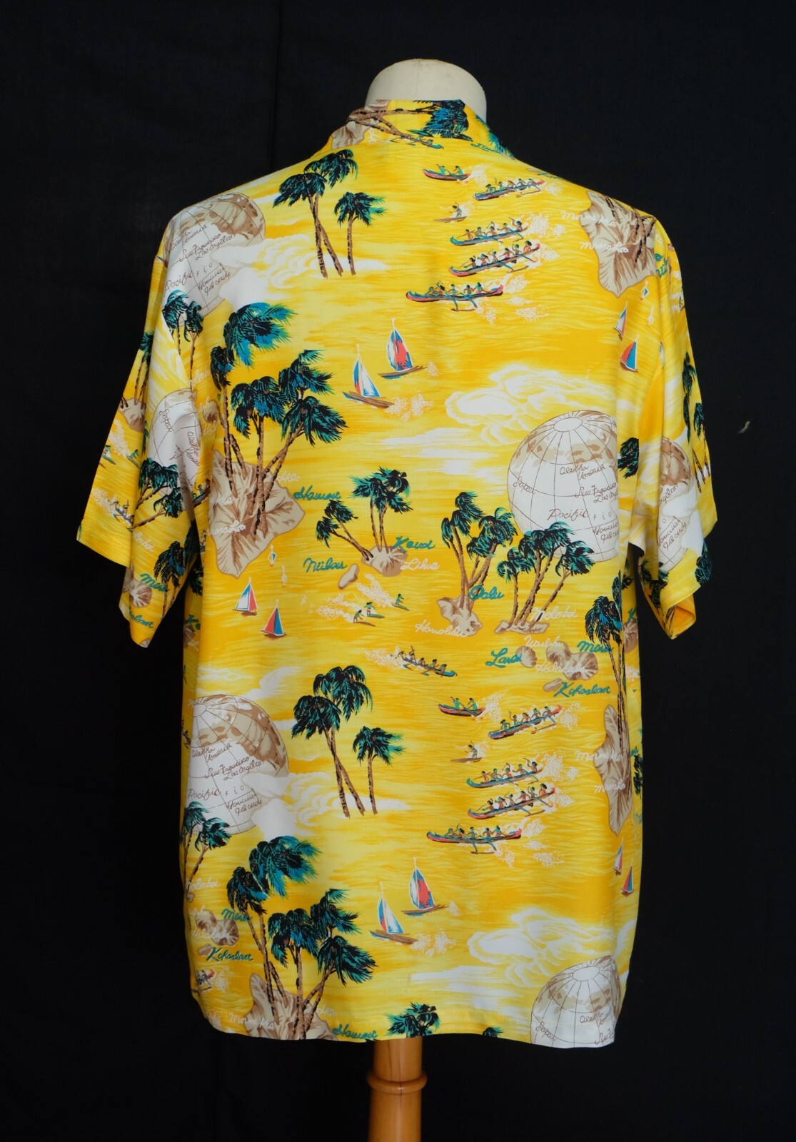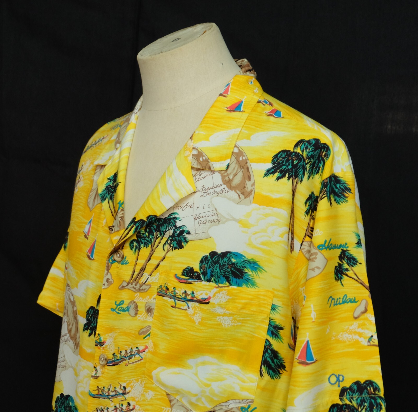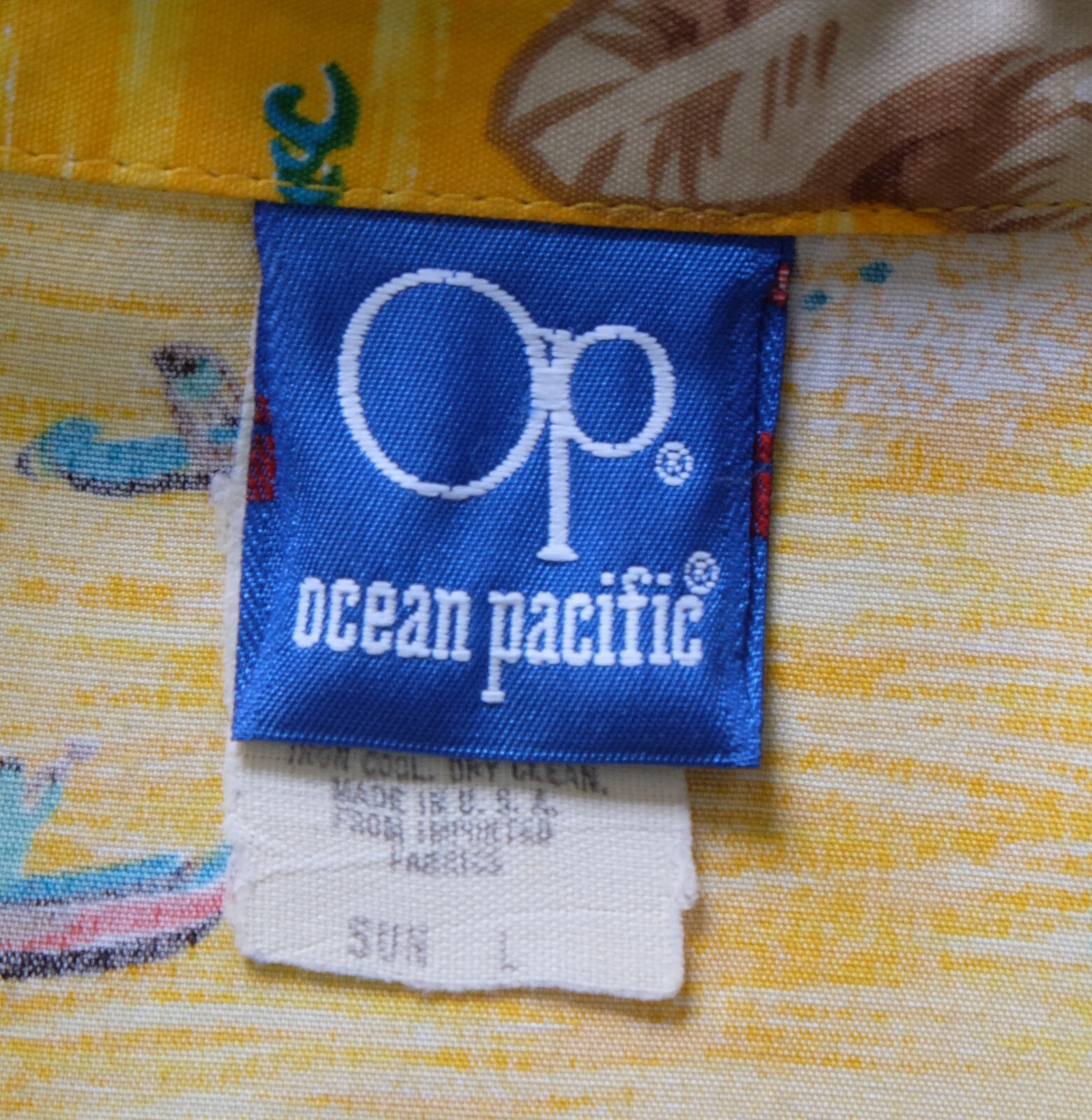 Awesome Vintage 80's Op Ocean Pacific yellow silky rayon men's Aloha Hawaiian shirt short sleeves size Large. Check out cool aloha shirt with Sailing, windsurfing, regatta, coconut, globe print patterns. The item is hawaii collar single pockets on left chest embroidered Op logo on end of left sleeve. 4 wood buttons closure on front, straight hem. Fabric is 100% silky rayon. The shirt is pre-owned still in excellent condition, no holes, tears, stains. It has been laundered clean and fresh ready to wear. Don't miss out cool and awesome vintage aloha hawaiian shirt.