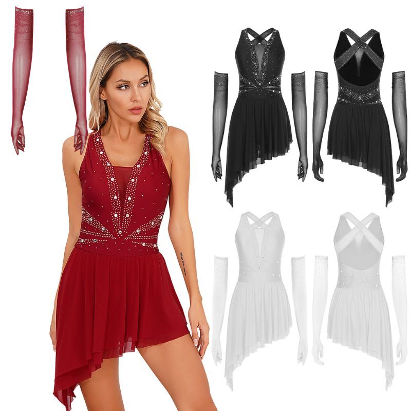 Sleeveless dance dress for women, see-through design, draped neck and asymmetrical hem adds fashion element.