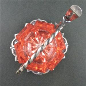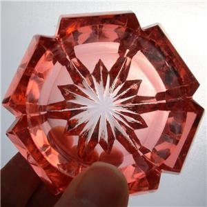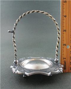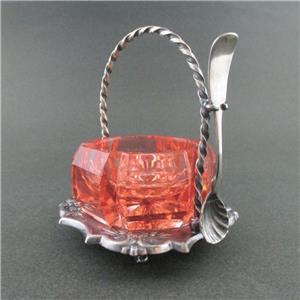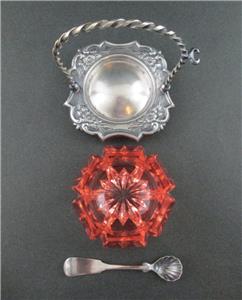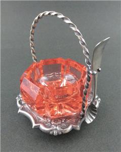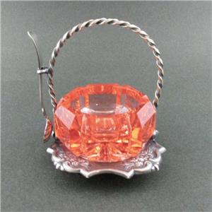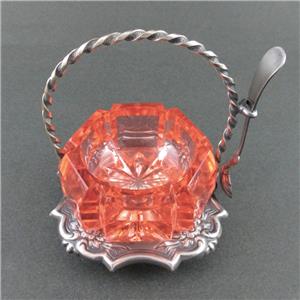 This is a wonderful Victorian era Master OPEN SALT dish presented in a footed, Quadruple Silver Plate Holder - from Simpson, Hall, Miller & Co. - decorated with embossed flowers at the corners and a Twist handle. The cut glass insert has 6 side panels with a Star cut base - in a lovely PEACHY orange color. It is notched to fit perfectly in the stand.