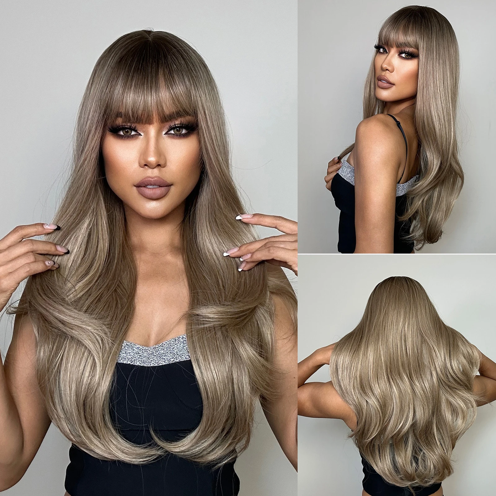 Long Wavy Brown Ombre Wig Synthetic Cosplay Wigs for Black Women Natural Wave Hair Daily Party Wig with Bangs Heat Resistant
