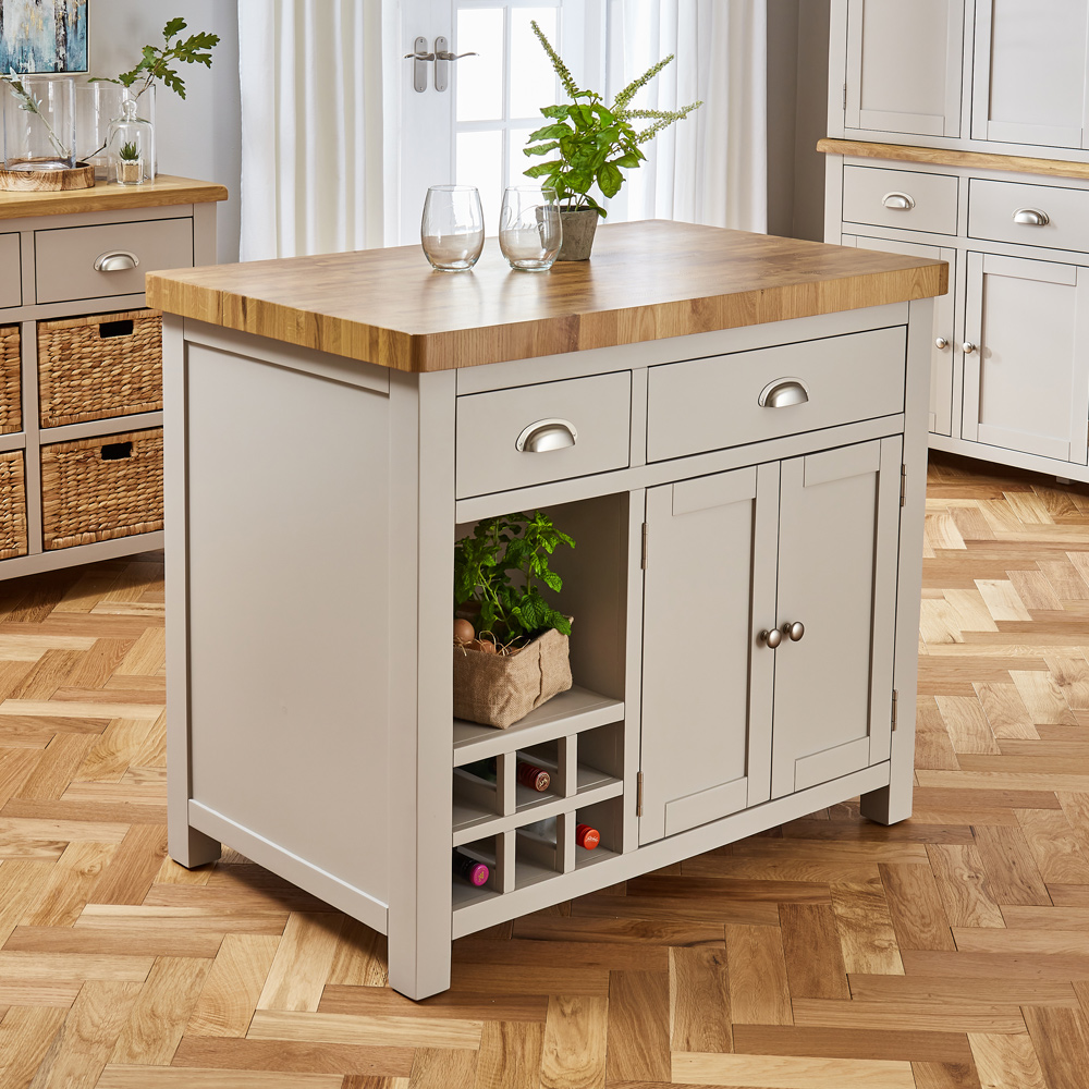 Cheshire Whitewash Oak Large Kitchen Island – Designed with functionality in mind, It features a natural white Carrara marble top which oozes elegance and sophistication, this exquisite marble top showcases delicate grey veining within the luminous white marble stone.. Storage is abundant, thanks to three spacious full-length drawers, accessible from both sides, alongside a large two-door cupboard with an internal shelf, ensuring easy reach from either side. At one end, a 30-bottle wine rack keeps your collection neatly organized, while the open shelf on the opposite side is perfect for displaying cookbooks and storing kitchenware—blending style with practicality in every detail. Unlike fixed islands, this unit offers flexibility, allowing you to reposition around your kitchen as needed.
