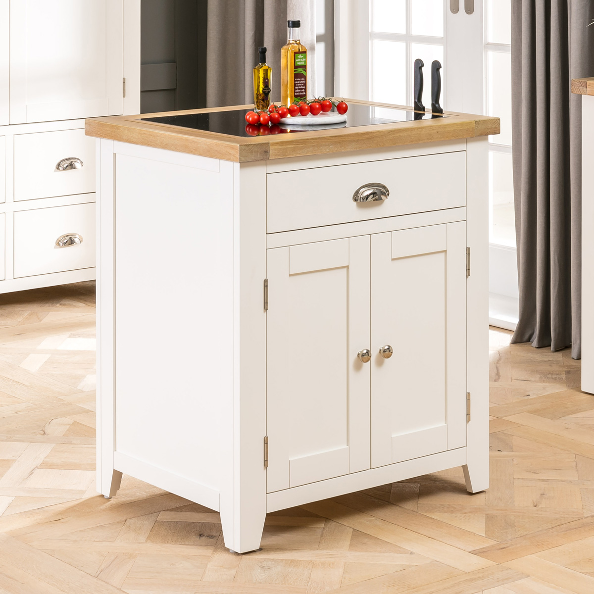 Timeless Shaker Design – This Cheshire Oak kitchen island showcases timeless shaker styling with the clean lines, panelled sides, elegantly tapered feet, and a 40mm thick oak top outer frame. Every detail reflects exceptional craftsmanship and the meticulous attention to detail that makes the Cheshire Oak range truly stand out.