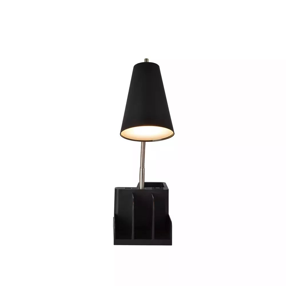 Instantly illuminate your work space with this LED Organizer Task Lamp from Room Essentials™. This compact desk lamp provides a convenient place to store your pens, sticky notes or anything else you want to keep within reach, and it features a USB port with phone stand to give you a convenient place to plug in your small electronic devices. The flexible neck and cone-shaped lampshade twist easily in any direction to focus the light where you need it the most. Just place this table lamp on your entryway or study table to create an inviting look in your living space. Base Dimensions: 4.25" H x 5" W x 7.5" D. Shade Bottom Dimensions: 4.5" W x 4.5" D. Assembled Dimensions: 16" H x 5" W x 11.38" D. Cable/Cord Length: 5 Feet