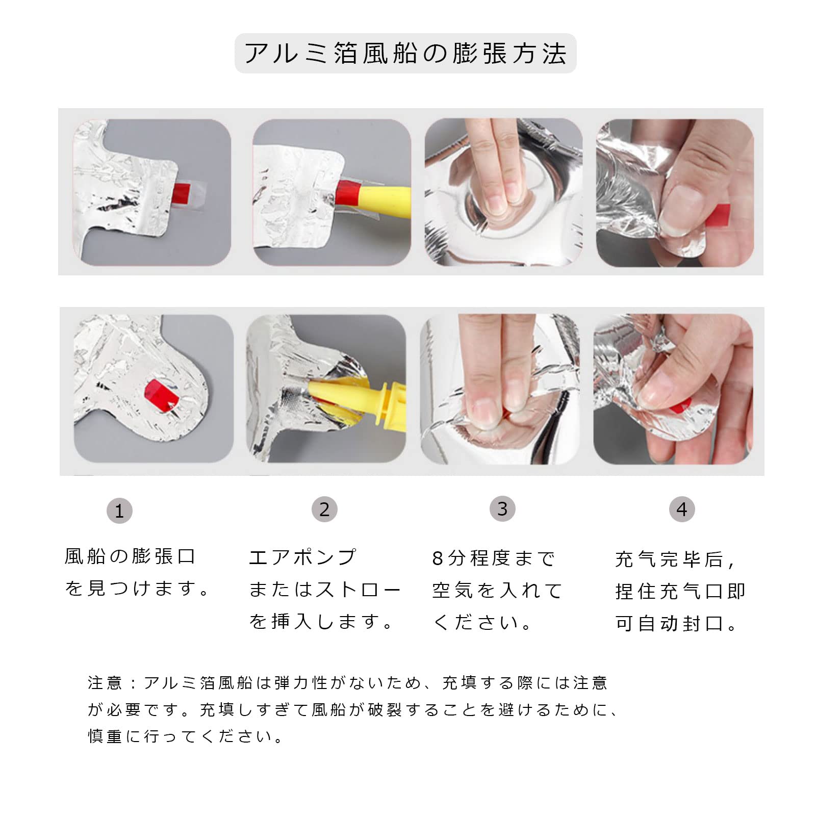 How to use: Insert a straw or air pump into the mouth of the balloon and fill it with air. It has a check valve to prevent air from escaping once inflated. The injection port is glued and may be difficult to insert a straw or hand pump. In that case, insert the straw into the injection port by pushing slowly and little by little.