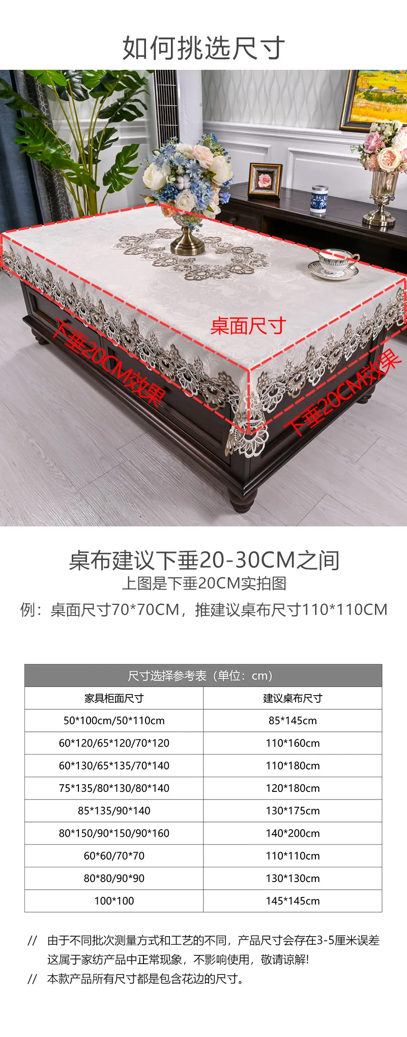 Length = table length + (30~40cm, so four sides droop 15~20cm)