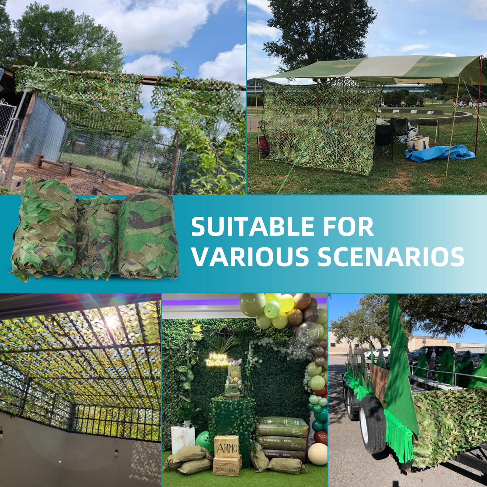 Extensive Applications: The camouflage net can be used for military activities, hunting, shooting, camping, party, home decoration, bird watching, paintball game setting, fence, car shading, etc.