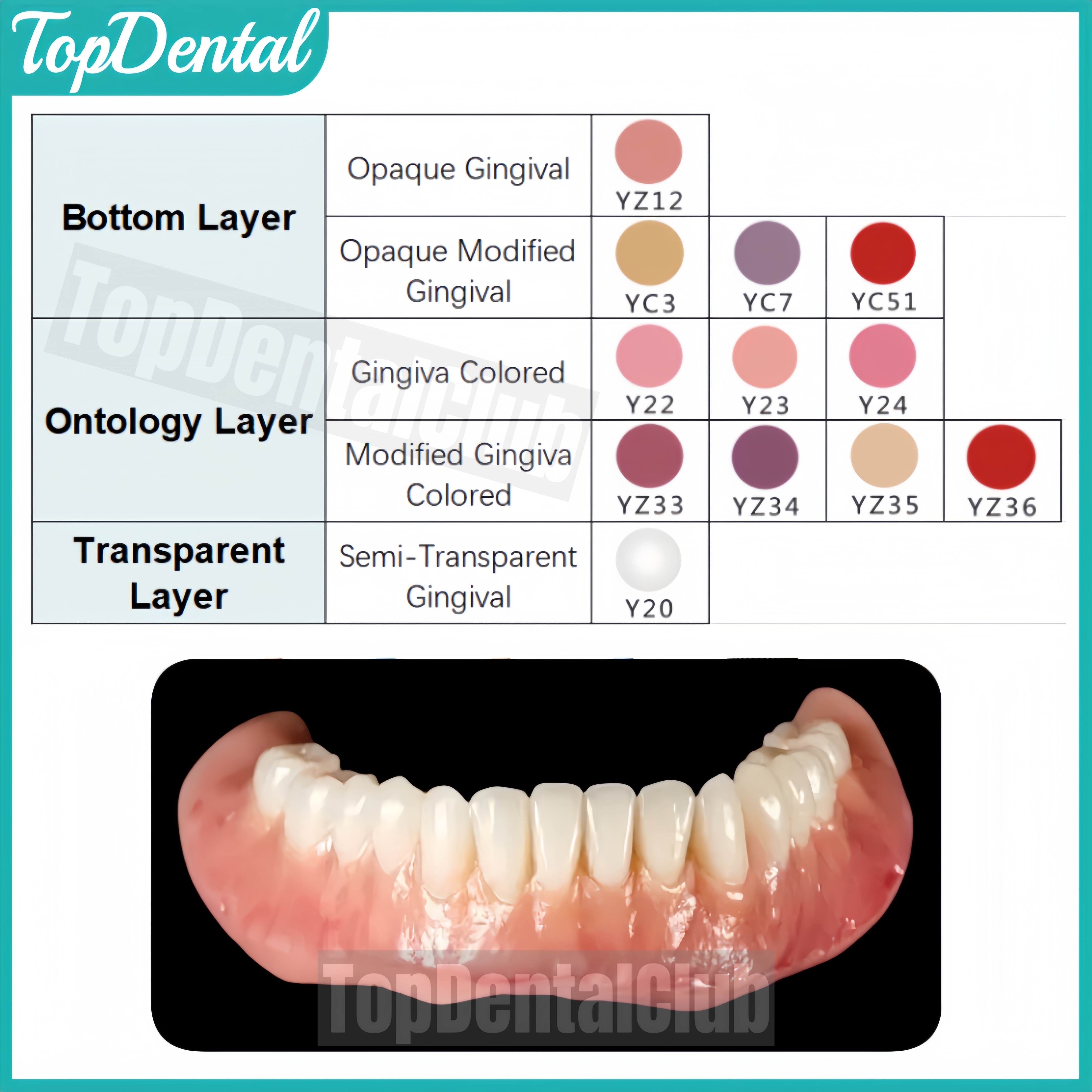 2.Based on natural gum color tones, the design is rich in color, with multiple gum colors and modifier colors that can simulate the various possibilities of gum color, achieving perfect color reproduction and meeting high aesthetic requirements;