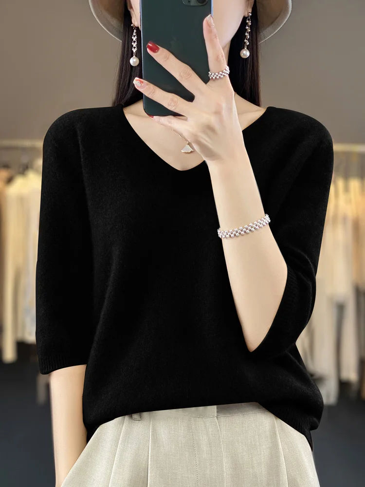 *Features: Fine 12-gauge fabric, Medium thickness. Normal fit, short sleeve V-neck design. Lightweight, Warm and soft. This V-neck pure merino wool sweater is suitable for fall and spring.