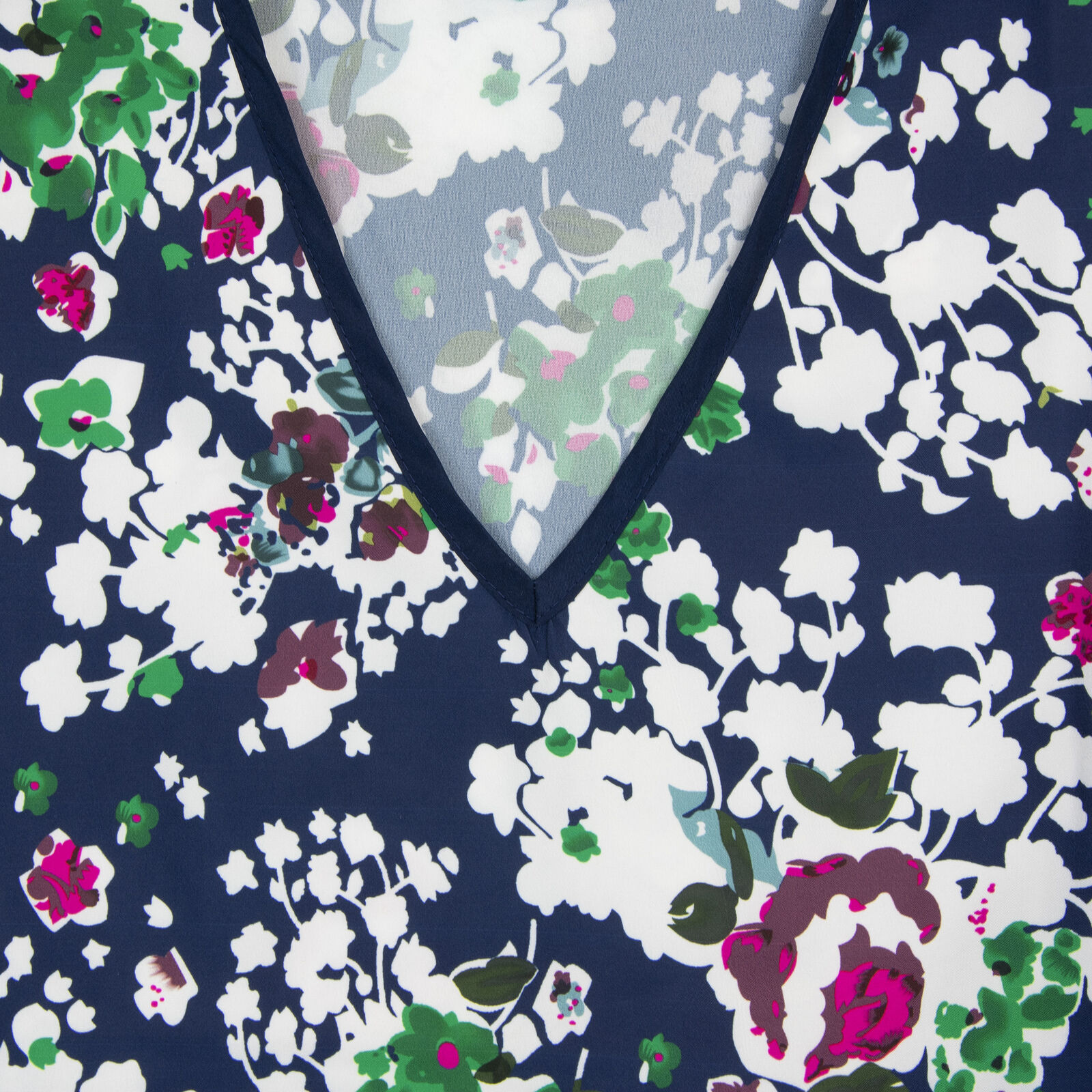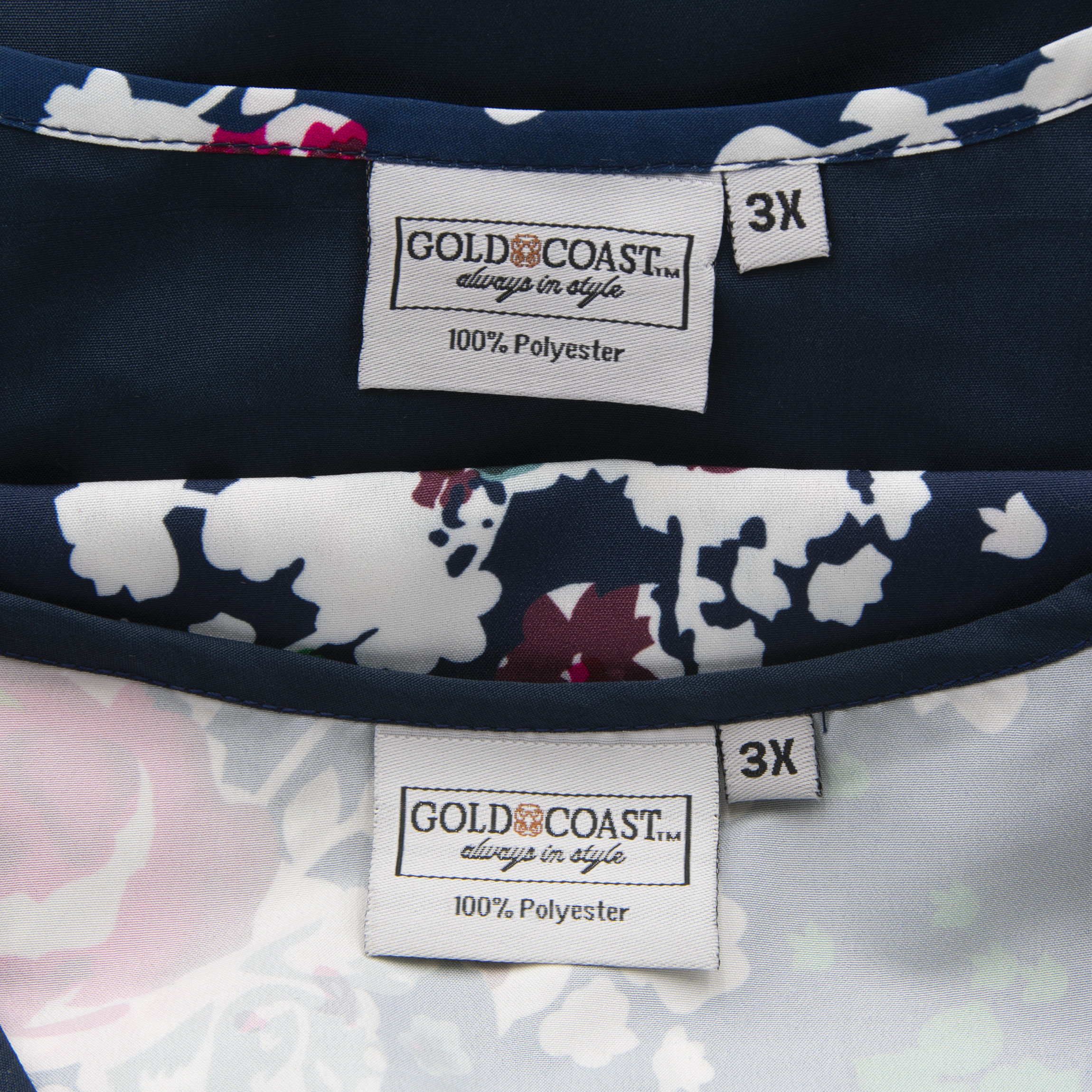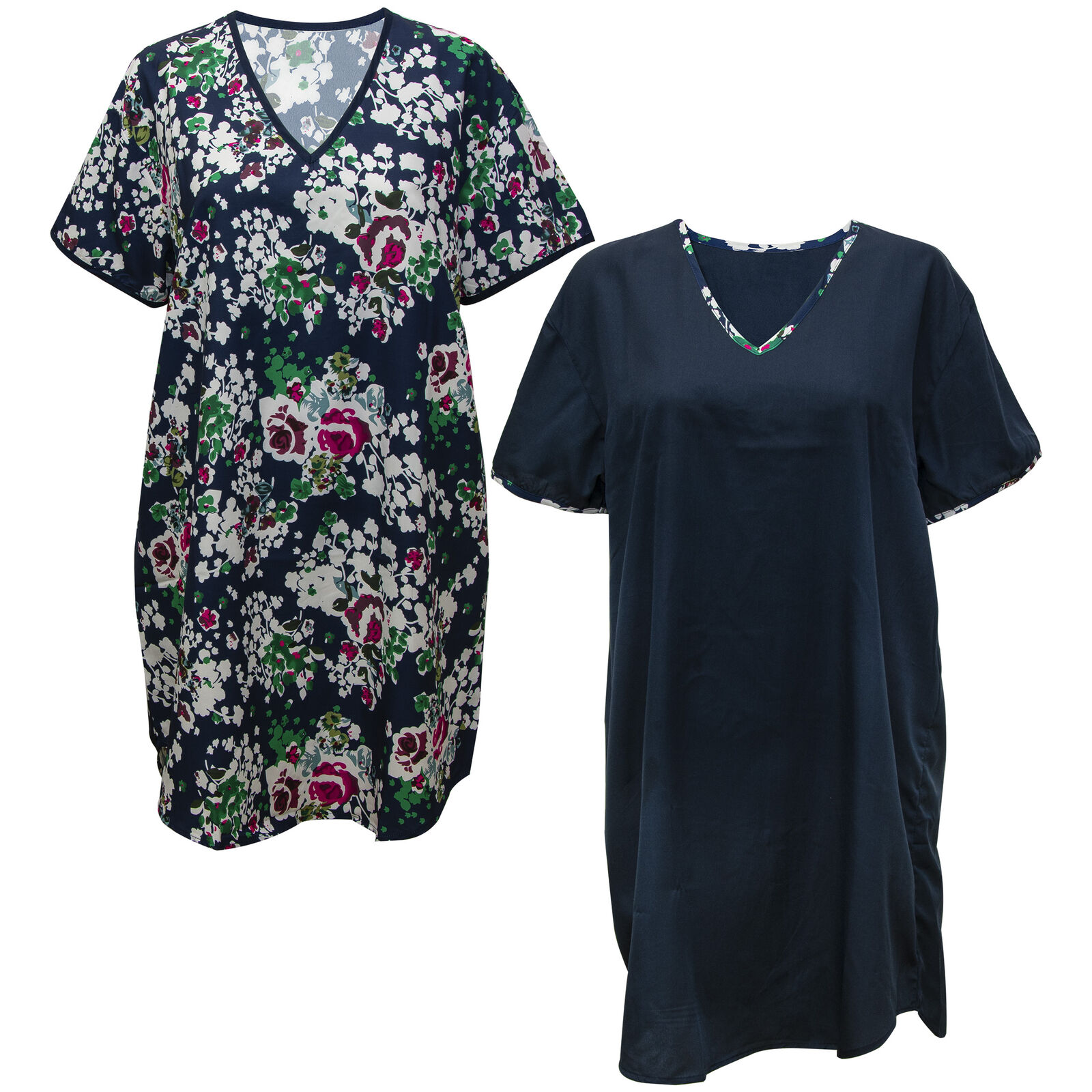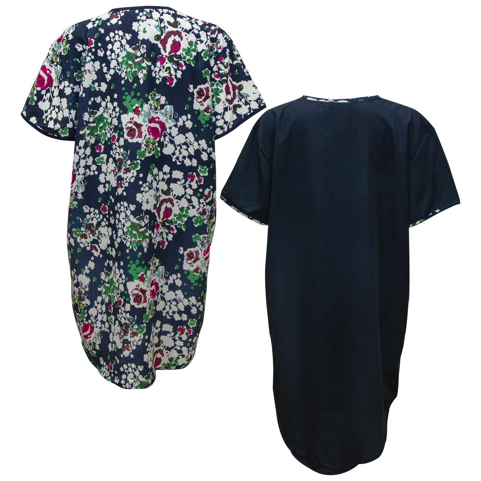 Be comfortable and stylish in this set of women's satin night shirts from Gold Coast. Both nightshirts feature a v-neck and short sleeves and are approximately knee length. One night shirt is a solid navy blue with a floral v-neck trim, the second is navy with a green, white and red flower pattern and a solid navy v-neck trim. These light pajamas are machine washable with like colors. The manufacturer recommends you tumble dry on low and do not bleach. Made of 100% Polyester. Measurements (Chest 30-inches, Length 39-inches, Sleeve length from shoulder 7-1/2-inches) Made in India.