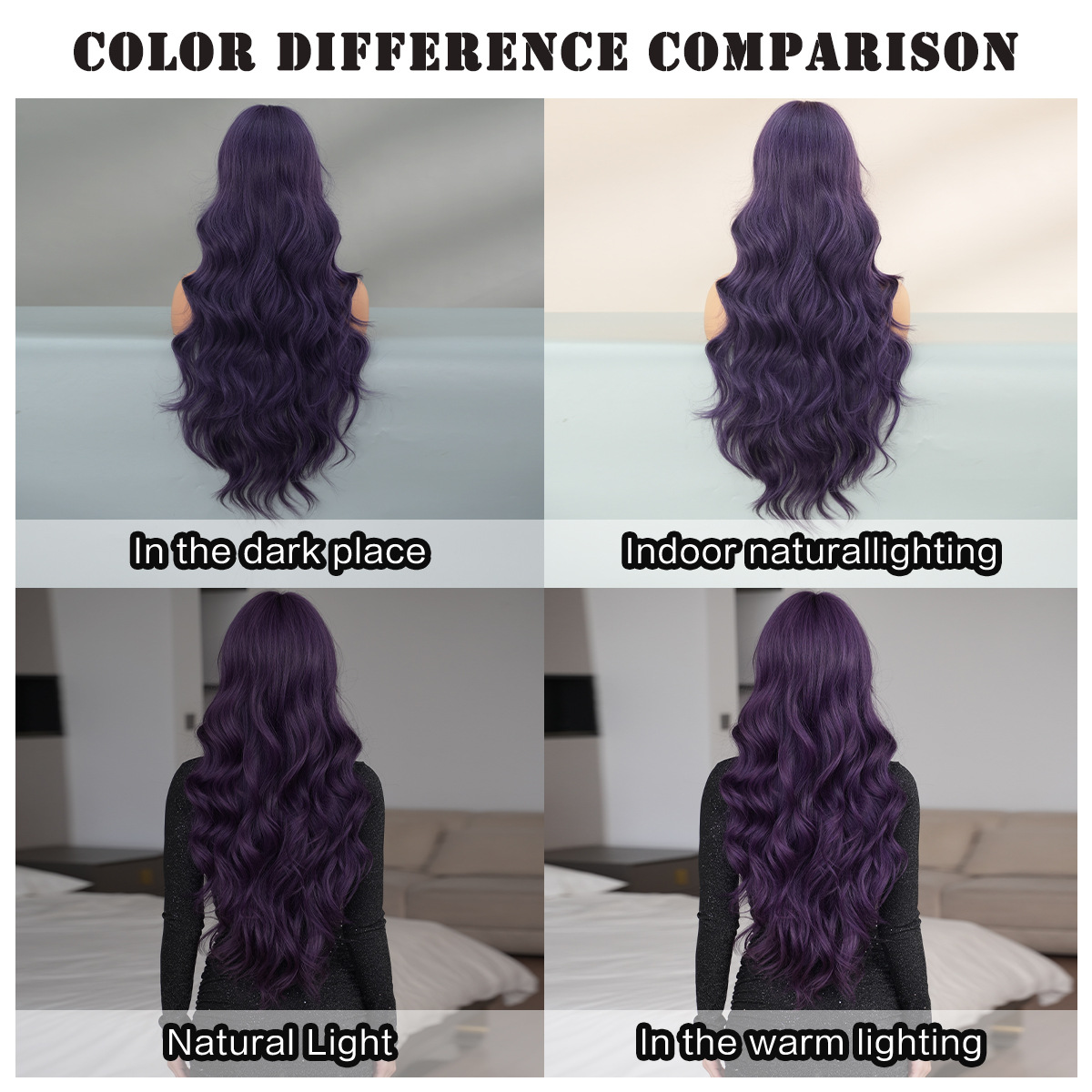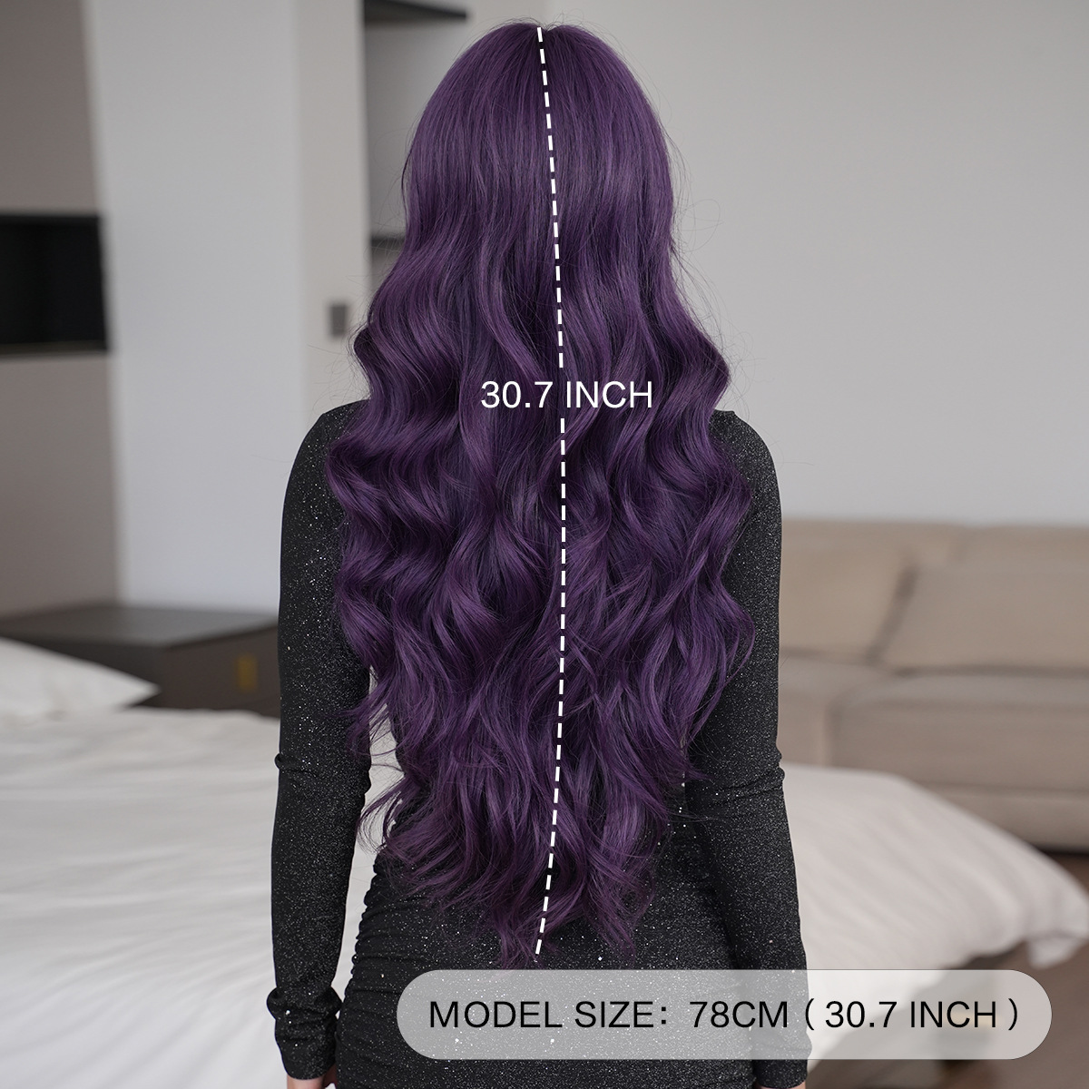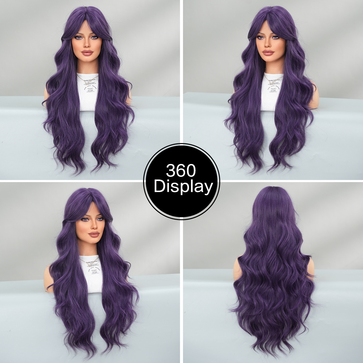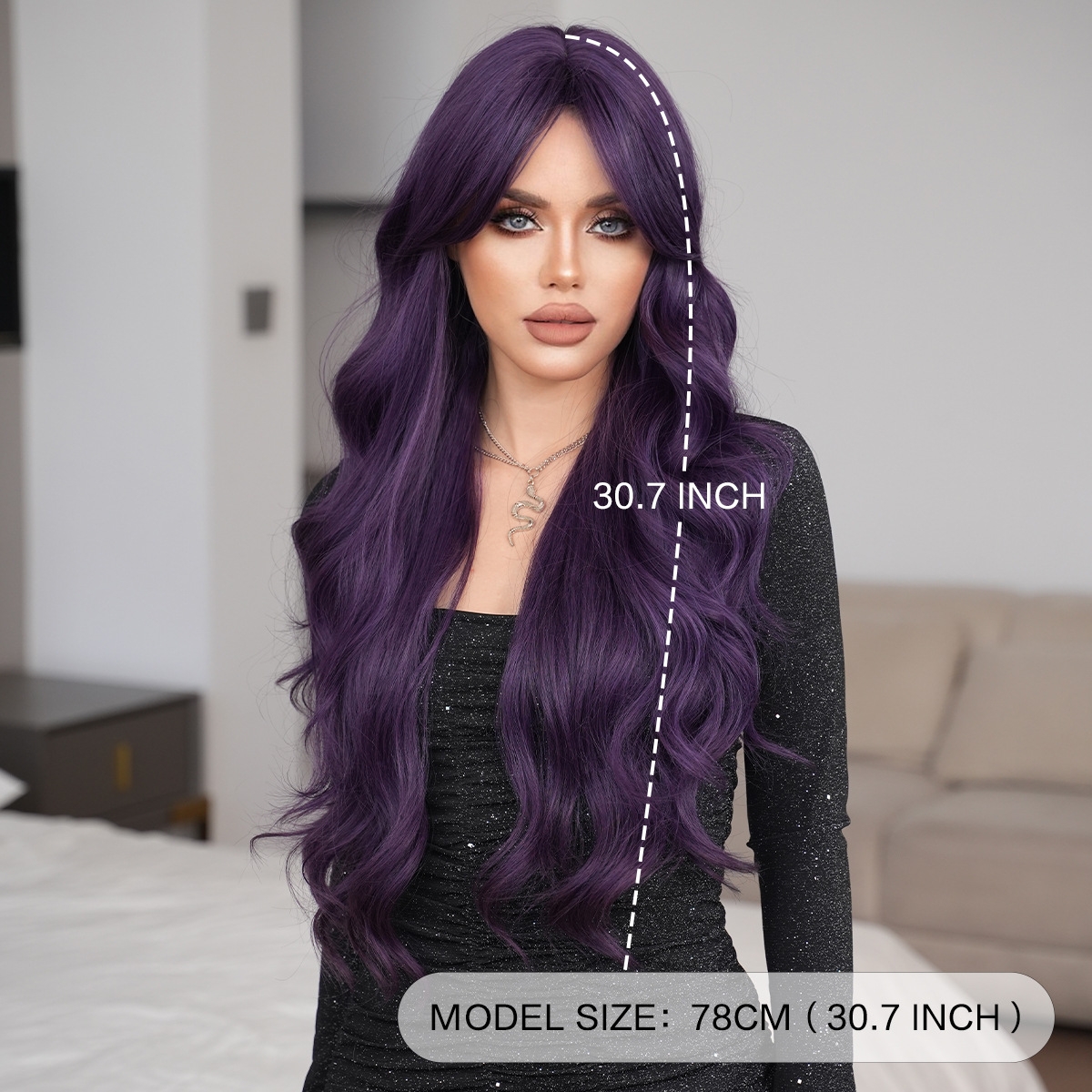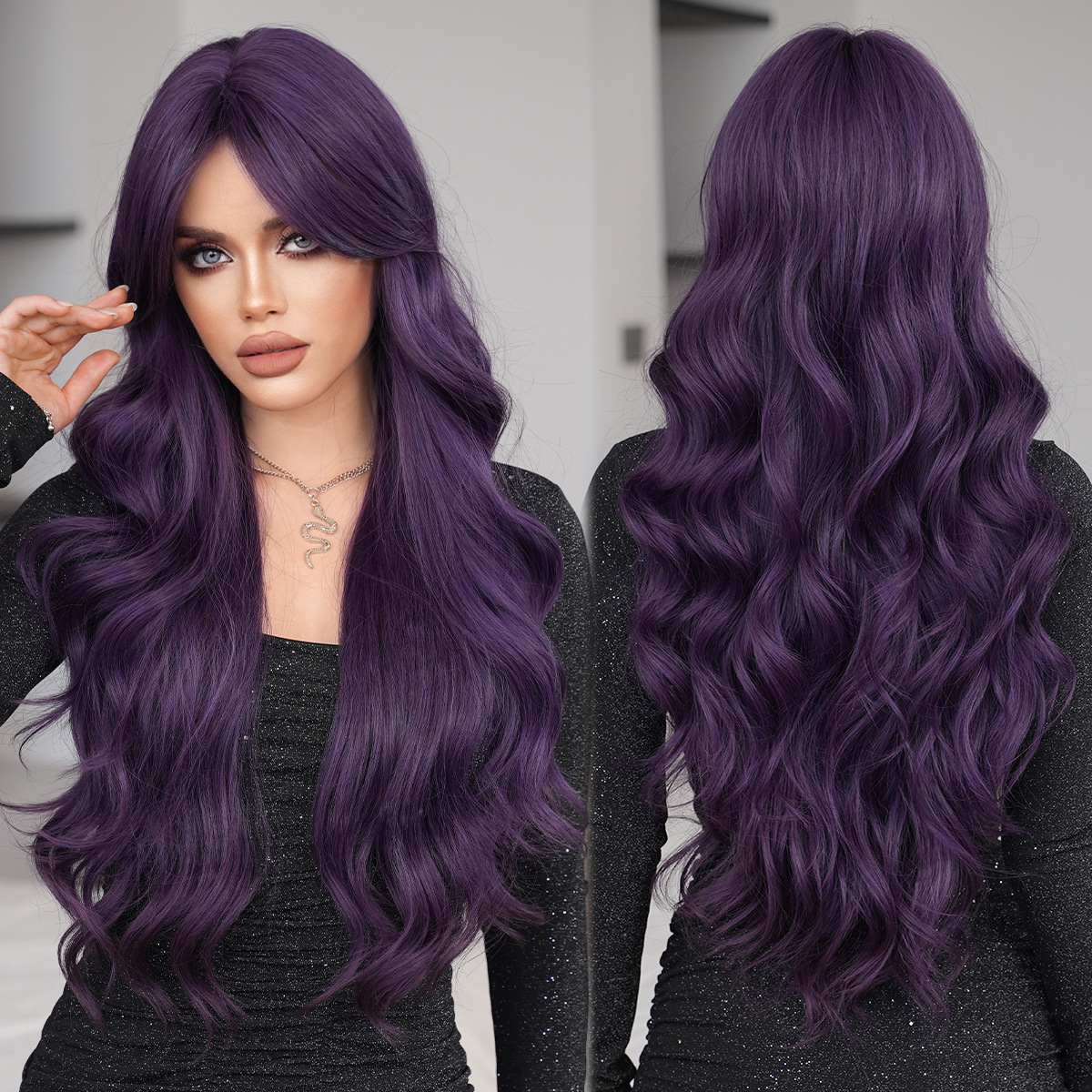 Crafted from high-temperature synthetic fiber, this wig delivers rich color and texture with a soft, realistic feel. The flowing waves and parted fringe frame the face beautifully, while the deep violet hue adds mystery and confidence.