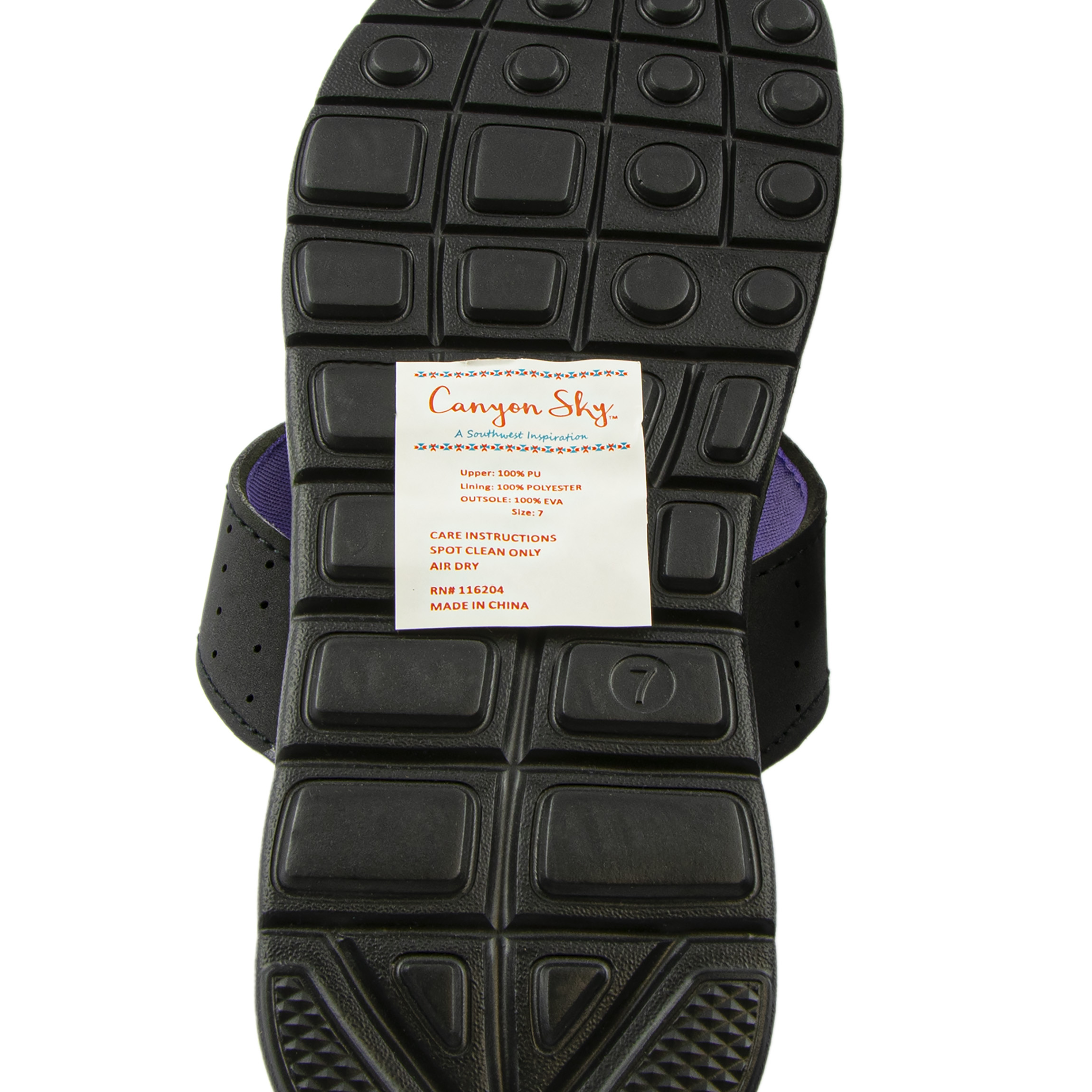 A comfortable and simple flip flop from Canyon Sky features a breathable black thong strap and colorful Aztec patterned foot-bed. The memory foam sole provides support and cushions the foot, even after all-day wear. The sandals have a strong and durable EVA outsole with a low 7/8-inch heel. These thong style slip-on sandals are a perfect fit for when you're headed to the beach, backyard or around town. This is a women's size 10 with a ENTER inch foot-bed. Material: 100% PU Upper, 100% Polyester Lining, 100% EVA Outsole.