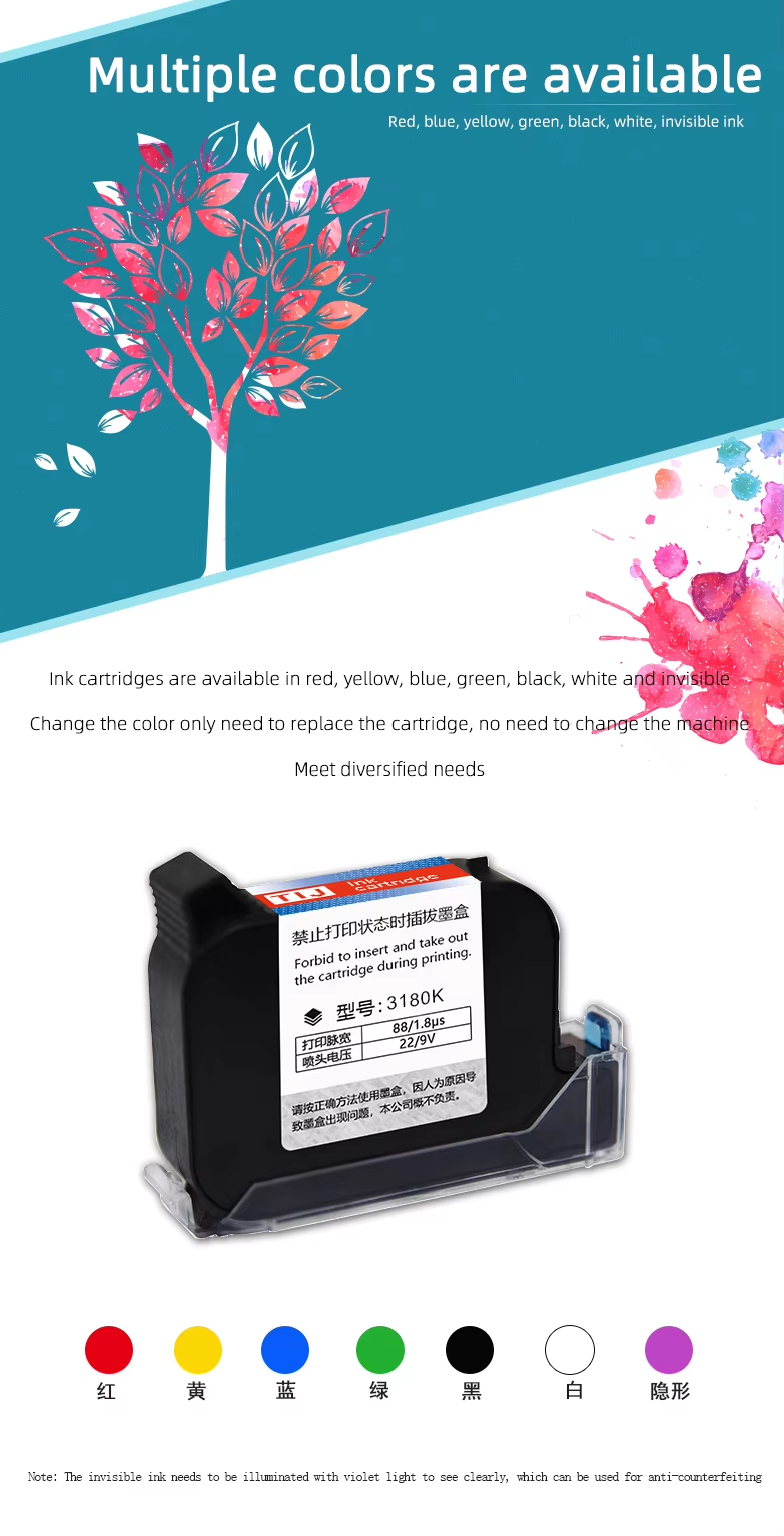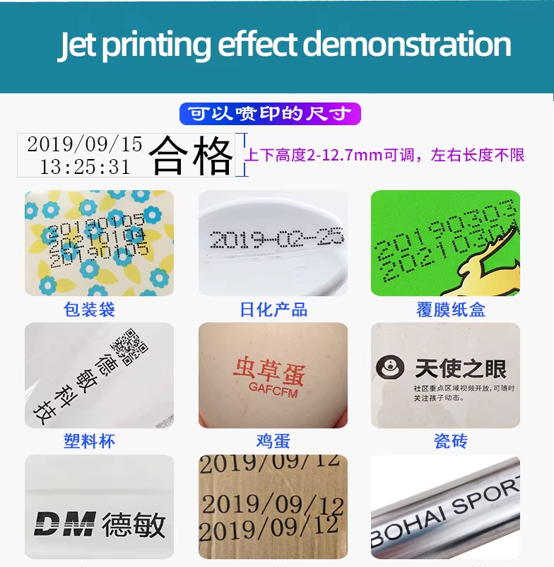 A:You can print date, text, logo, variable data, batch number, QR code, serial number and other content. Red, yellow, blue, green, black, white and other colors are available.