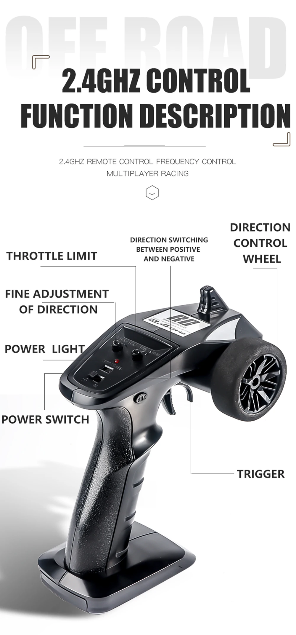 1.2.4G full proportional synchronized remote control system. Full proportional throttle/steering.