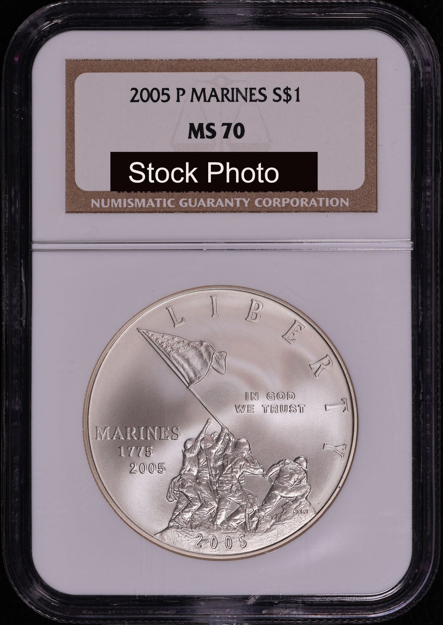 2005-P Marines Silver Dollar Commemorative NGC MS-70. This is a stock listing so the one pictured may not be the one you receive. The coins may display faint milky spots and/or minor scuffs on the NGC holders.