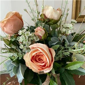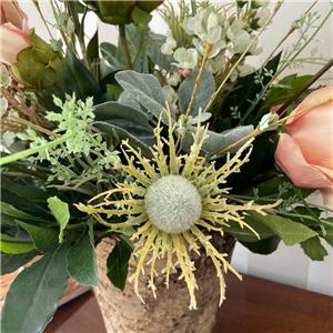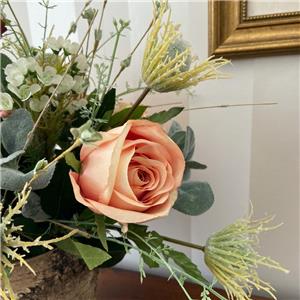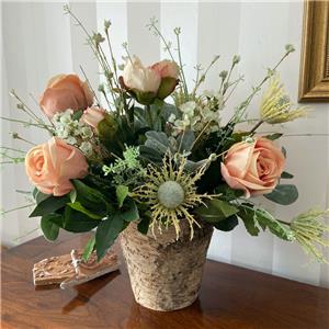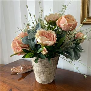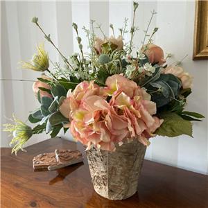 This very pretty arrangement is ideal for adding a special touch to any room. Quality and realistic blush pink flowers including peonies, roses, hydrangeas and thistles are designed in a rustic birch vase.