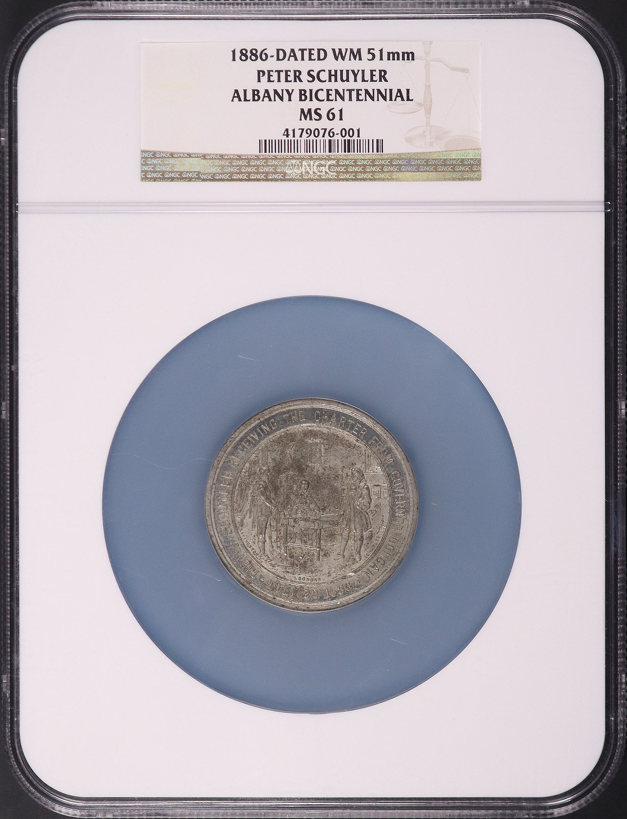 1886 Peter Schuyler Albany Bicentennial WM 51mm NGC MS-61. Both sides of the NGC holder display noticeable scuffs and scratches.