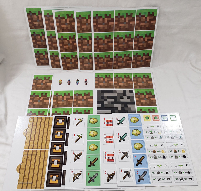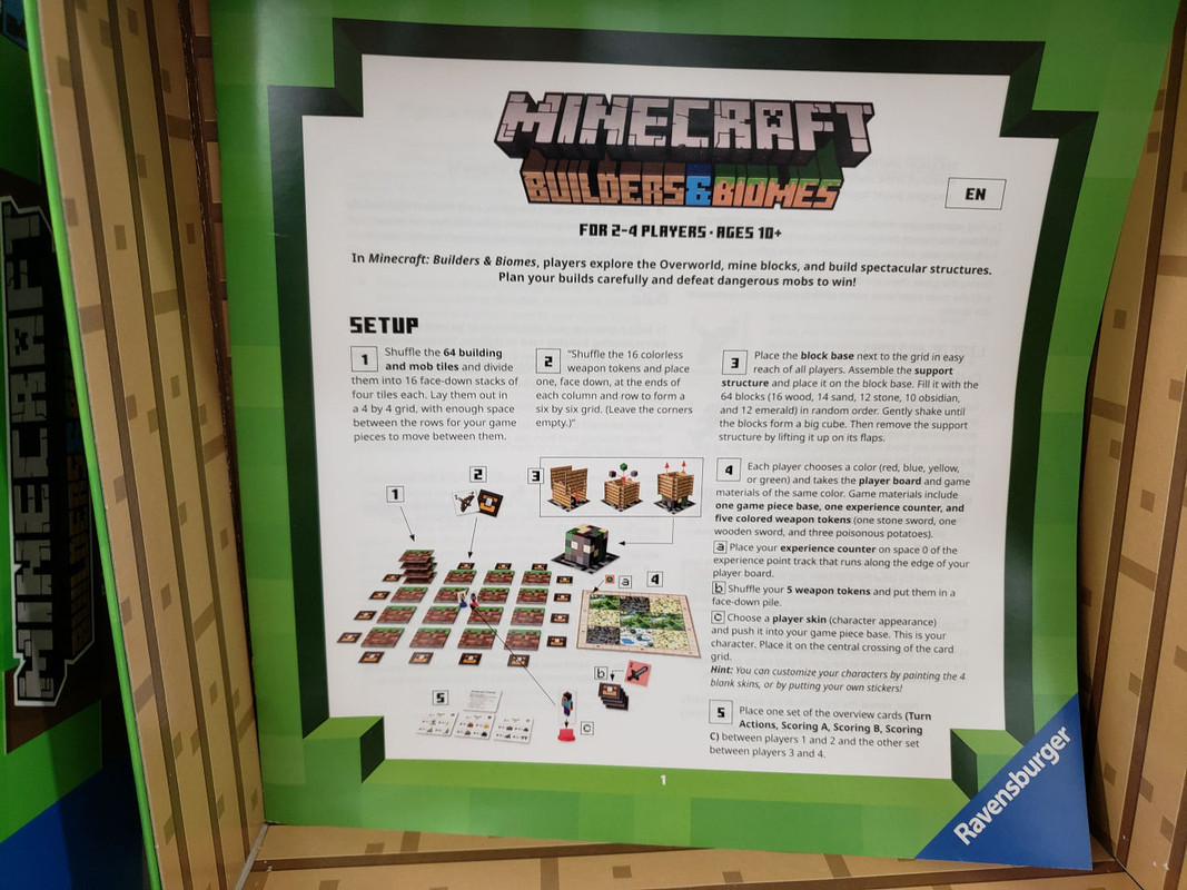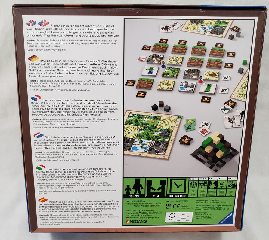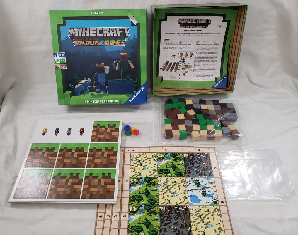 Minecraft Builders & Biomes Boardgame The board game was opened, but never used. All tile pieces remain unpunched from the cardboard. The box has creases extending from the corners. The front face of the box has a tear near the top-right corner. Check out the pictures below for more detail. |