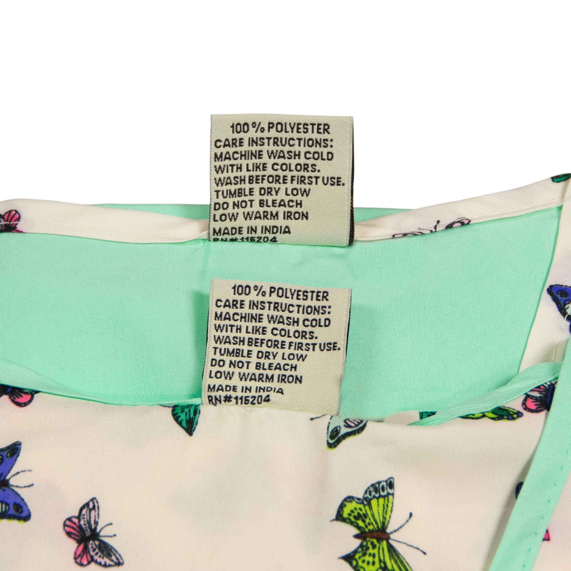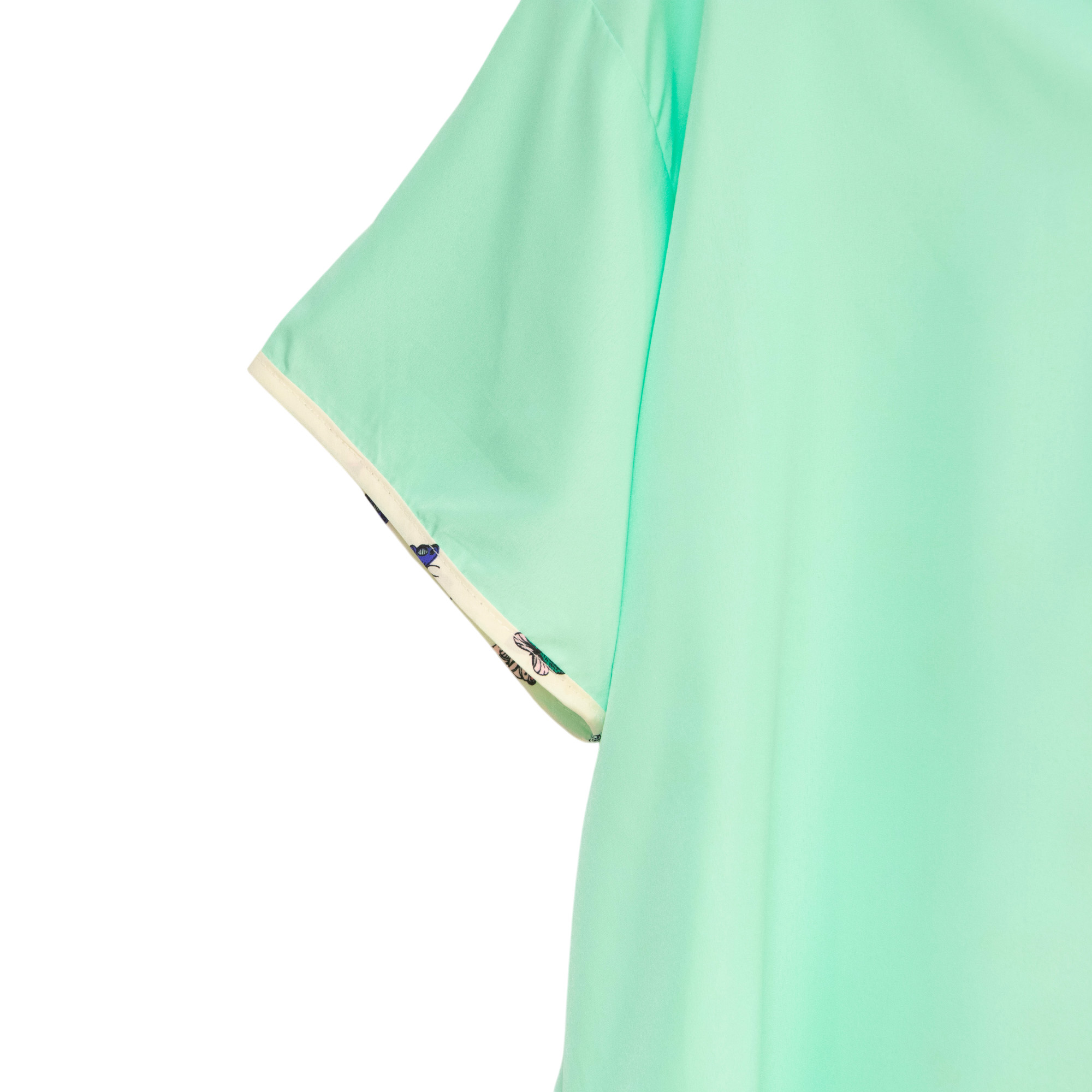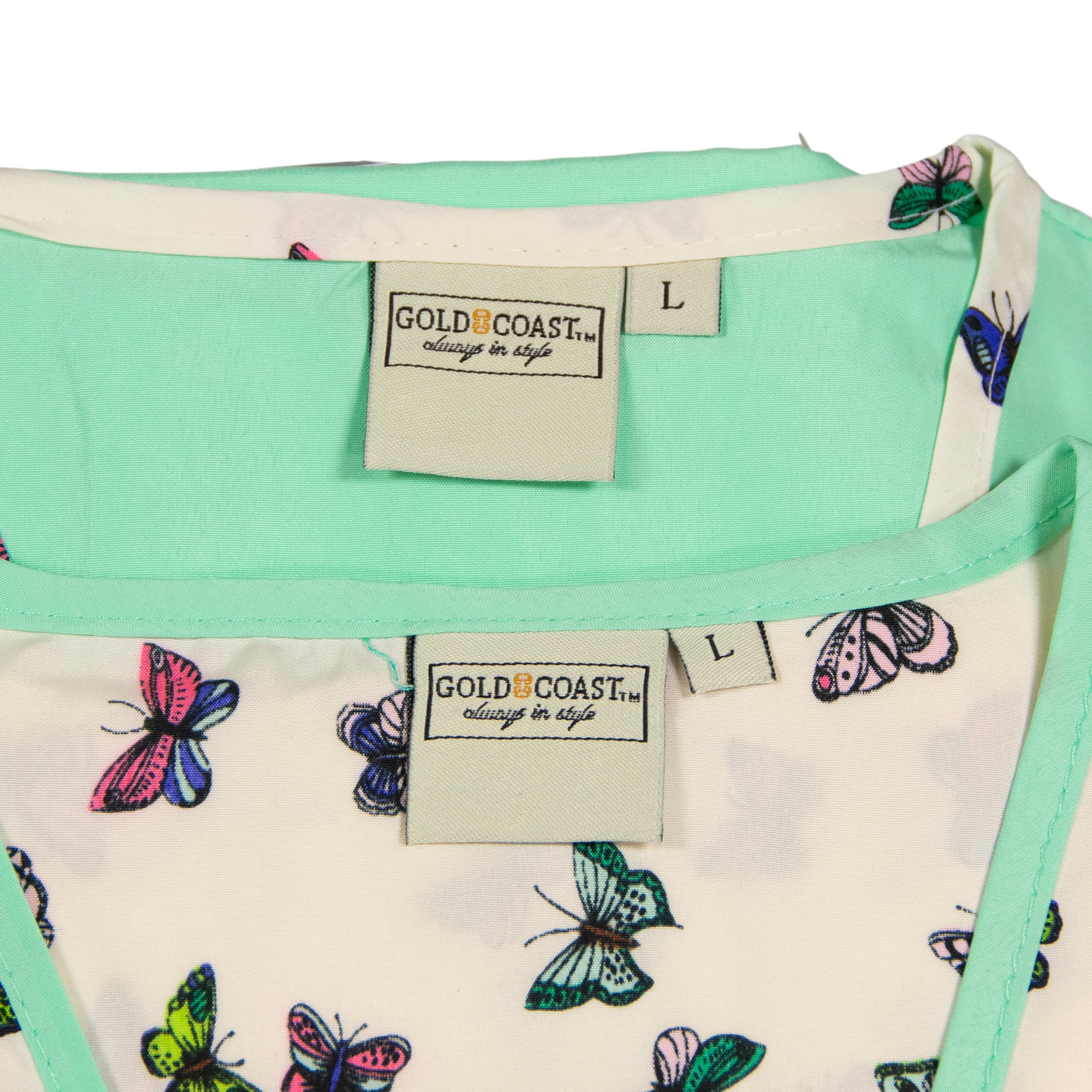 Be comfortable and stylish in this set of women's satin night shirts from Gold Coast. Both knee length nightgowns feature a v-neckline and short sleeves. One night shirt is a solid light green with a butterfly patterned trim while the coordinating shirt is opposite with a butterfly pattern and light green trim. The lightweight women's pajama shirts are made from a 100% Polyester material. Machine washable. This set comes in a women's size large. Measurements: 37.5" length, 24" chest,7" sleeves. Made in India.
