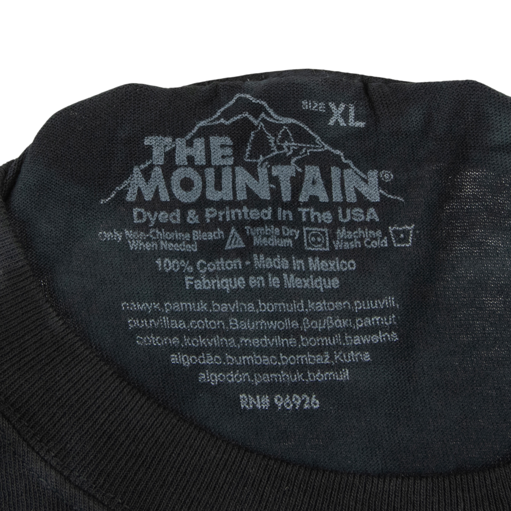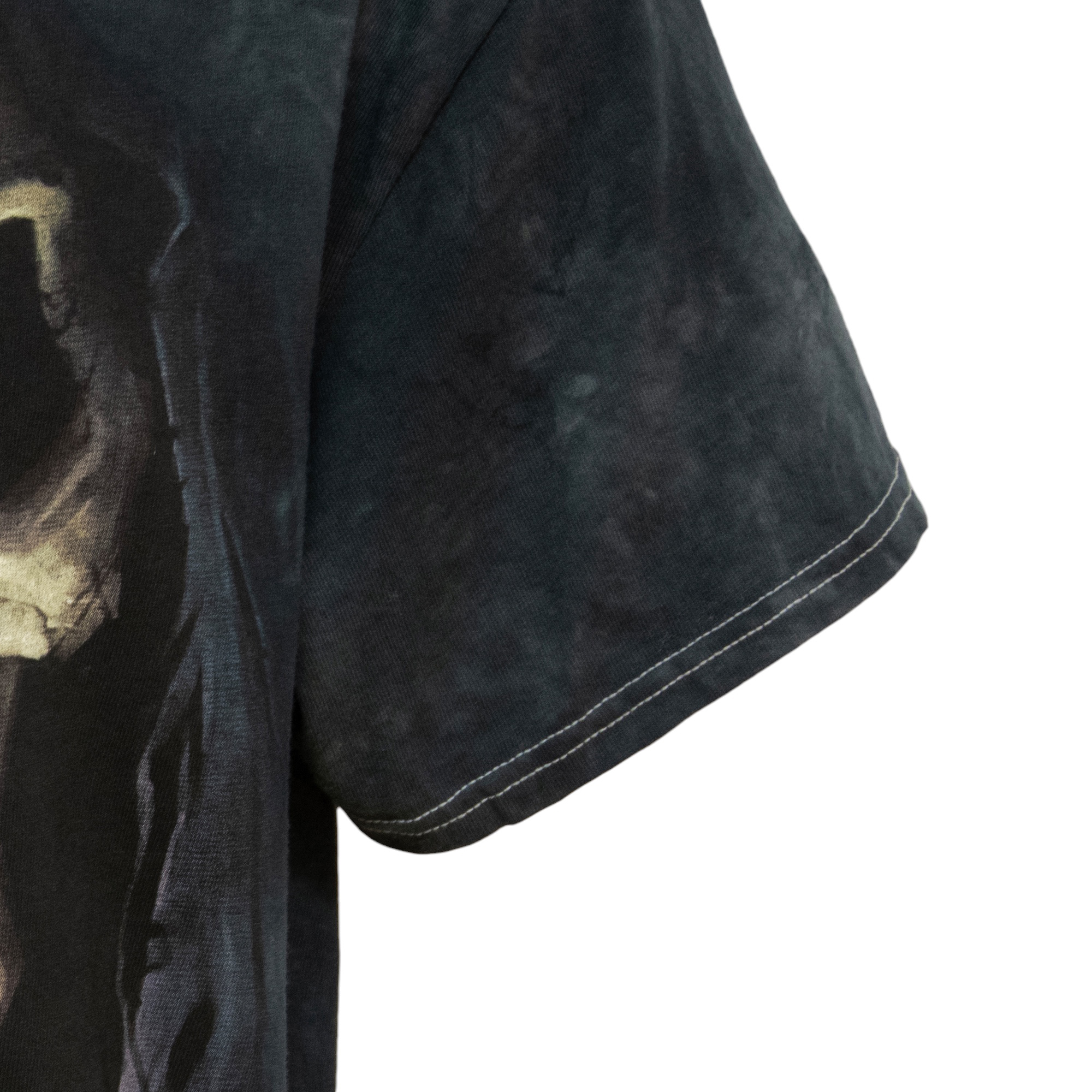 Show your dark side in The Mountain Big Face Death Men's Graphic Print T-Shirt. Perfect for any Halloween or goth event, this relaxed fit black tee with crew neck features an oversized graphic skull print on the front with a unique hand-dyed background design. Made of 100% cotton, this short sleeve t-shirt has reinforced double stitching for optimal comfort and durability. This machine-washable goth t-shirt is made in Mexico and tagged a men's size x-large. Measurements: 24" Chest, 29" Overall Length, 8" Sleeve Length.